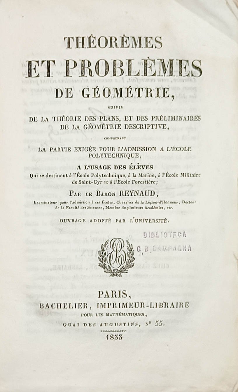 Antoine André L. Reynaud, Théorèmes Et Problèmes De Géométrie de la theorie des plans, et des préliminaires de la géométrie descriptive, comfremant la partie exigée pour l'admission a L'École Polytechnique, a l'usage des élèves Qui se destinent à l'École Polytechnique, à la Marine, à l'École Militaire e Saint-Cyr et à l'Ecole Forestière