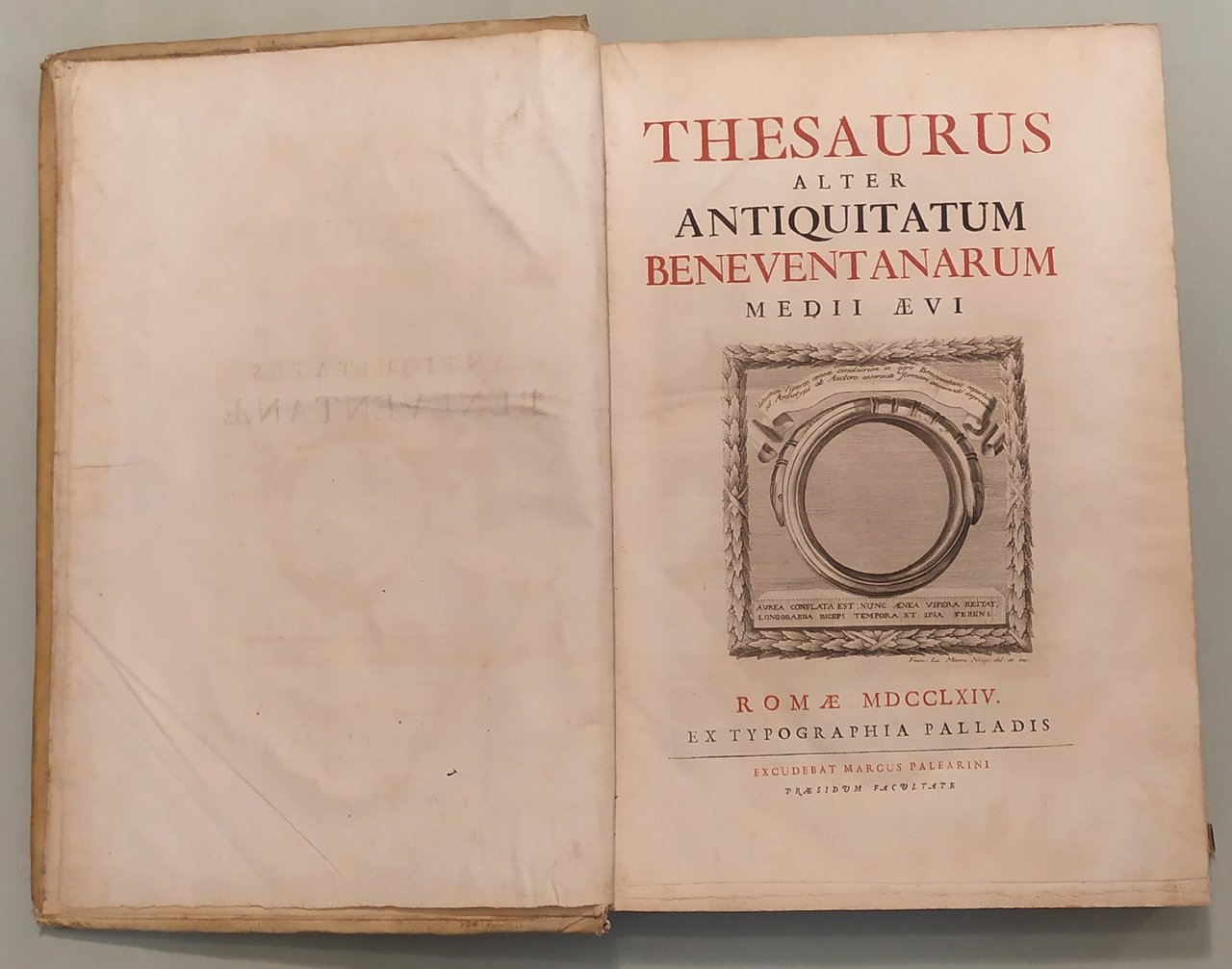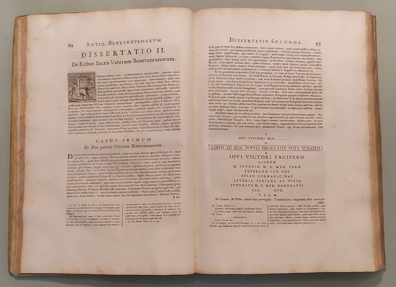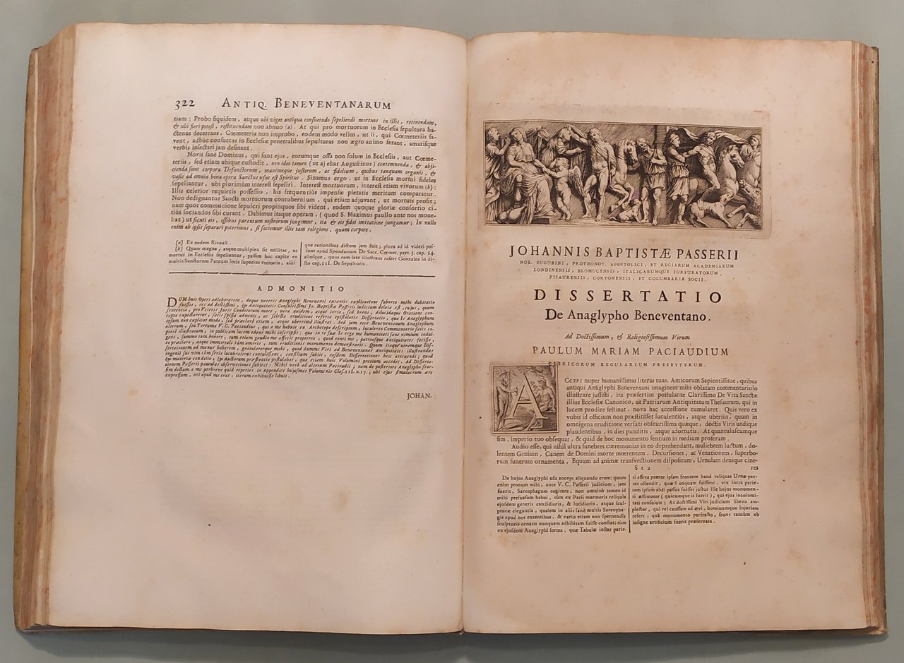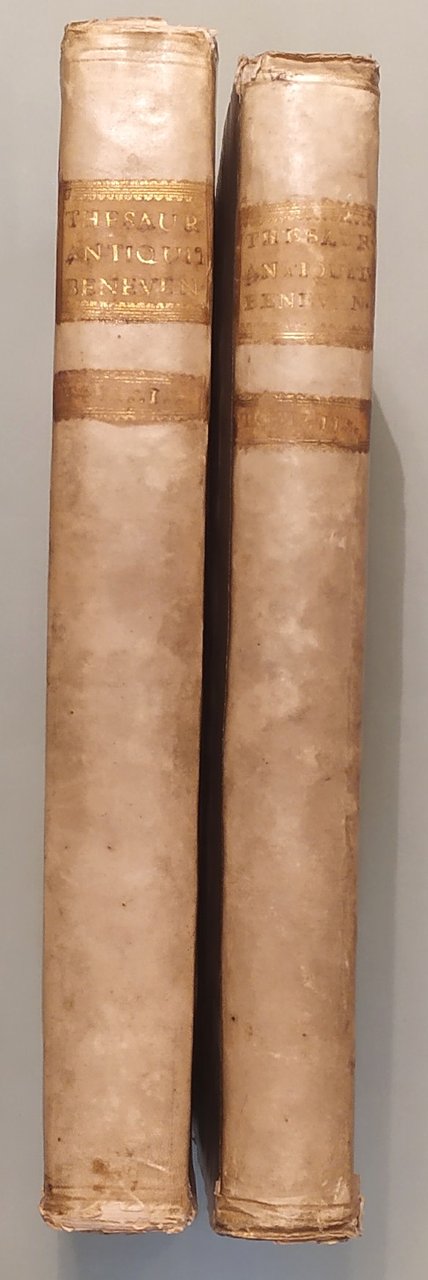 2 volumi. Vol. I: Thesaurus Antiquitatum Beneventanarum. Volume II: Thesaurus Alter Antiquitatum Beneventanarum Medii Aevii. Romae, ex Typographia Palladis, excudebant Nicolaus et Marcus Palearini, 1754-1764. Due volumi in folio; pp. XIII, 350, 4 n.nn.,LXXXII, 2 n.nn; pp. XVI, 4n.nn., 521, 1 con errata. Frontespizi con caratteri neri e rossi e differenti insegne tipografiche. Testate, capilettera, finaletti riccamente ornati. Intercalati nel testo illustrazioni e ritratti. Sette tavole incise in rame fuori testo tra cui quella raffigurante l'Arco di Traiano e quella a doppia facciata con la Porta della Cattedrale. Esemplare marginoso. Pergamena coeva, doppio tassello ai dorsi con titolo e fregi in oro. Lieve abrasione al piatto posteriore del volume primo. Edizione rarissima ed unica. Brunet V, 806; Cicognara 4114: "Quest'opera fu intitolata a Benedetto XV e venne stampata pulitamente con buone tavole fra le quali deve trovarsi nel primo volume la bella tavola dell'Arco di Benevento intagliata da Gaultier nel 1752"; Giustiniani, Biblioteca storica e topografica del Regno di Napoli, pag. 19: "Opera di moltissimo conto, non solo per i tanti interessanti monumenti, che ci raccolse, che per la maniera benanche colla quale seppe scriverla l'eruditissimo autore"; Bibliotheca Platneriana, pag. 61; Lozzi I pag. 141, nota.