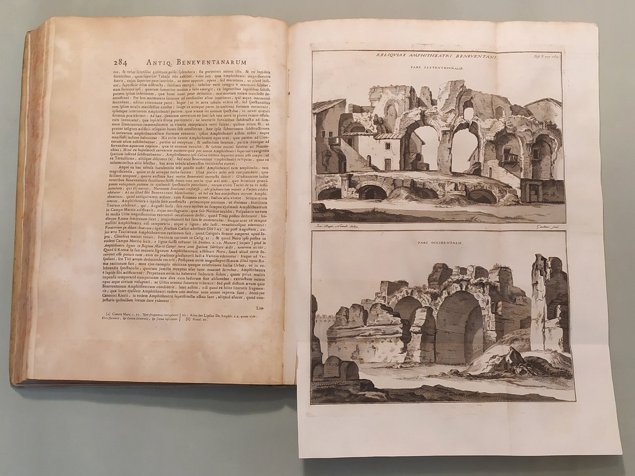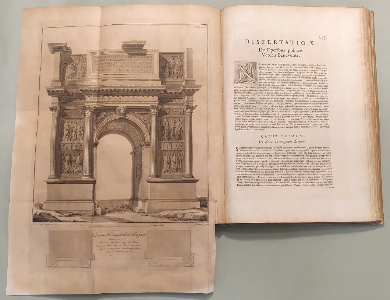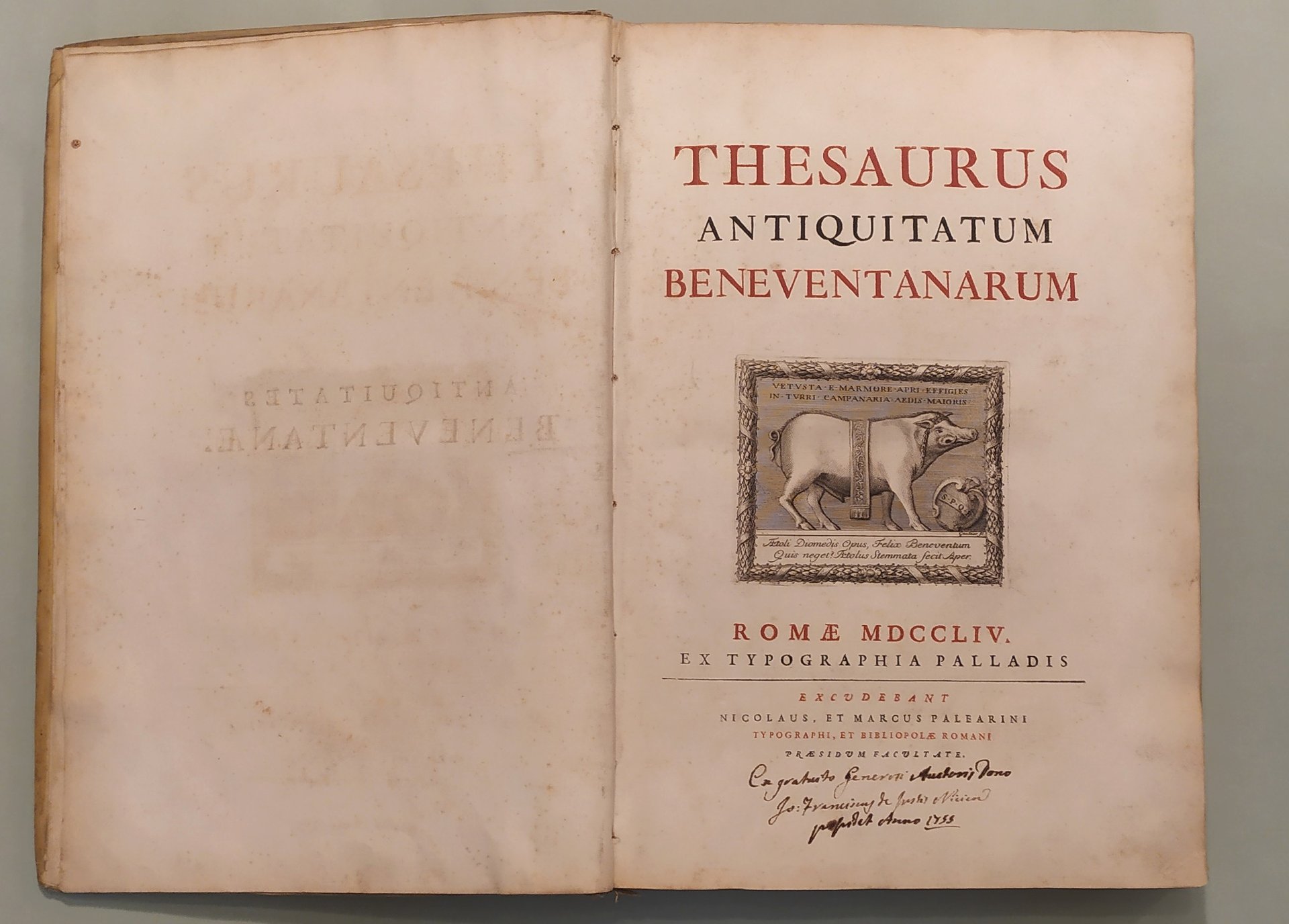 2 volumi. Vol. I: Thesaurus Antiquitatum Beneventanarum. Volume II: Thesaurus Alter Antiquitatum Beneventanarum Medii Aevii. Romae, ex Typographia Palladis, excudebant Nicolaus et Marcus Palearini, 1754-1764. Due volumi in folio; pp. XIII, 350, 4 n.nn.,LXXXII, 2 n.nn; pp. XVI, 4n.nn., 521, 1 con errata. Frontespizi con caratteri neri e rossi e differenti insegne tipografiche. Testate, capilettera, finaletti riccamente ornati. Intercalati nel testo illustrazioni e ritratti. Sette tavole incise in rame fuori testo tra cui quella raffigurante l'Arco di Traiano e quella a doppia facciata con la Porta della Cattedrale. Esemplare marginoso. Pergamena coeva, doppio tassello ai dorsi con titolo e fregi in oro. Lieve abrasione al piatto posteriore del volume primo. Edizione rarissima ed unica. Brunet V, 806; Cicognara 4114: "Quest'opera fu intitolata a Benedetto XV e venne stampata pulitamente con buone tavole fra le quali deve trovarsi nel primo volume la bella tavola dell'Arco di Benevento intagliata da Gaultier nel 1752"; Giustiniani, Biblioteca storica e topografica del Regno di Napoli, pag. 19: "Opera di moltissimo conto, non solo per i tanti interessanti monumenti, che ci raccolse, che per la maniera benanche colla quale seppe scriverla l'eruditissimo autore"; Bibliotheca Platneriana, pag. 61; Lozzi I pag. 141, nota.