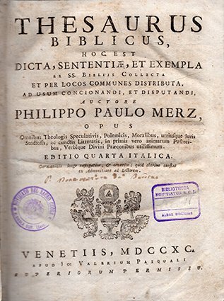 Hoc est dicta, sententiae, et exempla ex SS. Bibliis collecta et per locos communes distributa, ad usum concionandi, et sisputandi. Gravi mancanze al dorso. Timbri di biblioteca al frontespizio