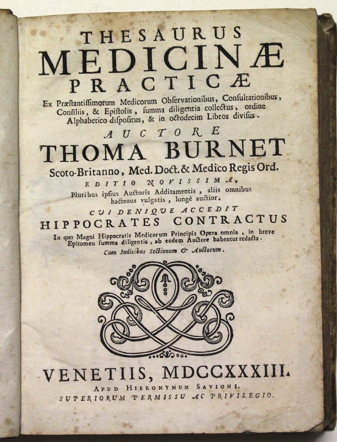 Thesaurus medicinae practicae.auctore Thoma Burnet Scoto - Britanno, Med. Doct. & Medico Regis Ord. editio novissima. cui denique accedit Hippocrates contractus. (Unito a:) Hippocrates contractus in quo magni Hippocratis medicorum principis opera
