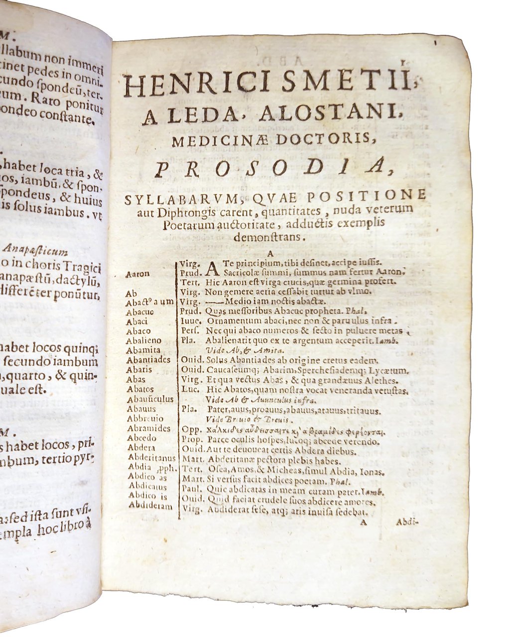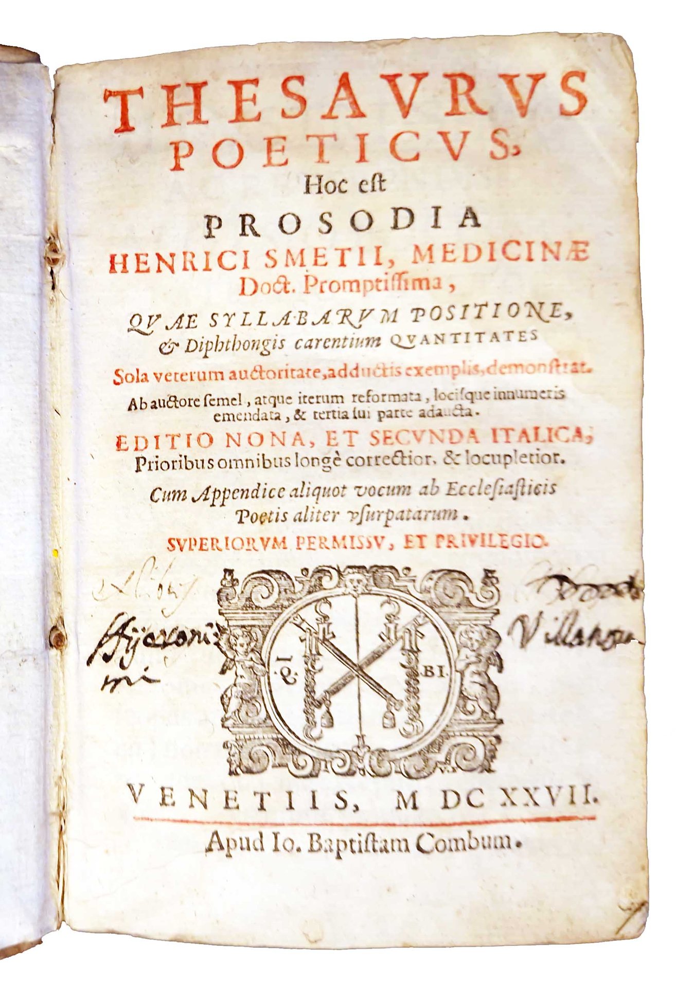 Thesaurus poeticus hoc est Prosodia Henrici Smetii, medicinae doct. Promptissima, quae syllabarum positione, & diphthongis carentium quantitates sola veterum auctoritate, adductis exemplis, demonstrat. . Ab auctore semel, atque iterum reformata, locisque innumeris emendata, & tertia sui parte adaucta. Editio nona, et secunda italica, prioribus omnibus longe correctior, & locupletior. Cun appendice aliquot vocum ab ecclesiasticis poetis aliter usurpatarum.