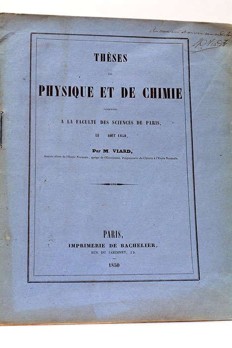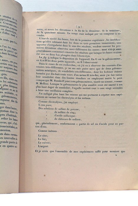 58 pages. 2 planches hors-texte. (1 feuillet blanc). (26,5x22 Cm). Broché. Couverture imprimée. Envoi de l'auteur sur la 1ère couverture. L'auteur propose une série d'observations et de statistiques sur l'influence de l'oxygène sur les piles. La thèse est complétée par une étude sur la corrosion des métaux au contact de l'air. Papier bruni et quelques rares taches, sinon exemplaire en très bon état.