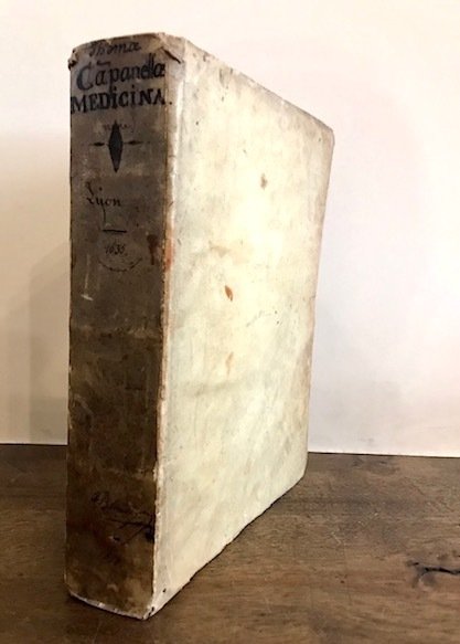4to (cm. 23,5), 14 cc.nn., 690 pp., 1 c.nn. Frontespizio in rosso e nero con impresa dei Gesuiti. Iniziali e fregi xilografici n.t. Legatura coeva in pergamena con titolo manoscritto al ds. Ex libris di collezione privata (’Docteur Blondin’) al frontespizio. Piccola mancanza al margine superiore bianco del frontis. Pagine leggermente ingiallite e qualche sporadica arrossatura, altrimenti esemplare genuino ed in ottimo stato di conservazione. Rarissima edizione originale. Edizione pubblicata a cura di Jacques Gaffarel (filosofo, noto Cabalista e bibliotecario di Richelieu) il cui nome appare nella prefazione. Vinciana (n. 1851): ‘Rara e importante opera, l’unica del Campanella che tratti di medicina. Interessante per gli studi di medicina generale ma particolarmente per gli studi sulla circolazione del sangue, gli effetti terapeutici del caldo e del freddo, la peste, le sincopi, l’epilessia, le malattie degli occhi, della gola, ecc., con un capitolo ‘De tumoribus malignis’ ed un altro sulle diverse febbri; l’A. fa pure delle considerazioni sui rapporti tra la medicina, la fisica e la chimica. Krivatsy, 2090; Wellcome, 1240; Thorndike VII, p. 300. Non in Br. Libr.