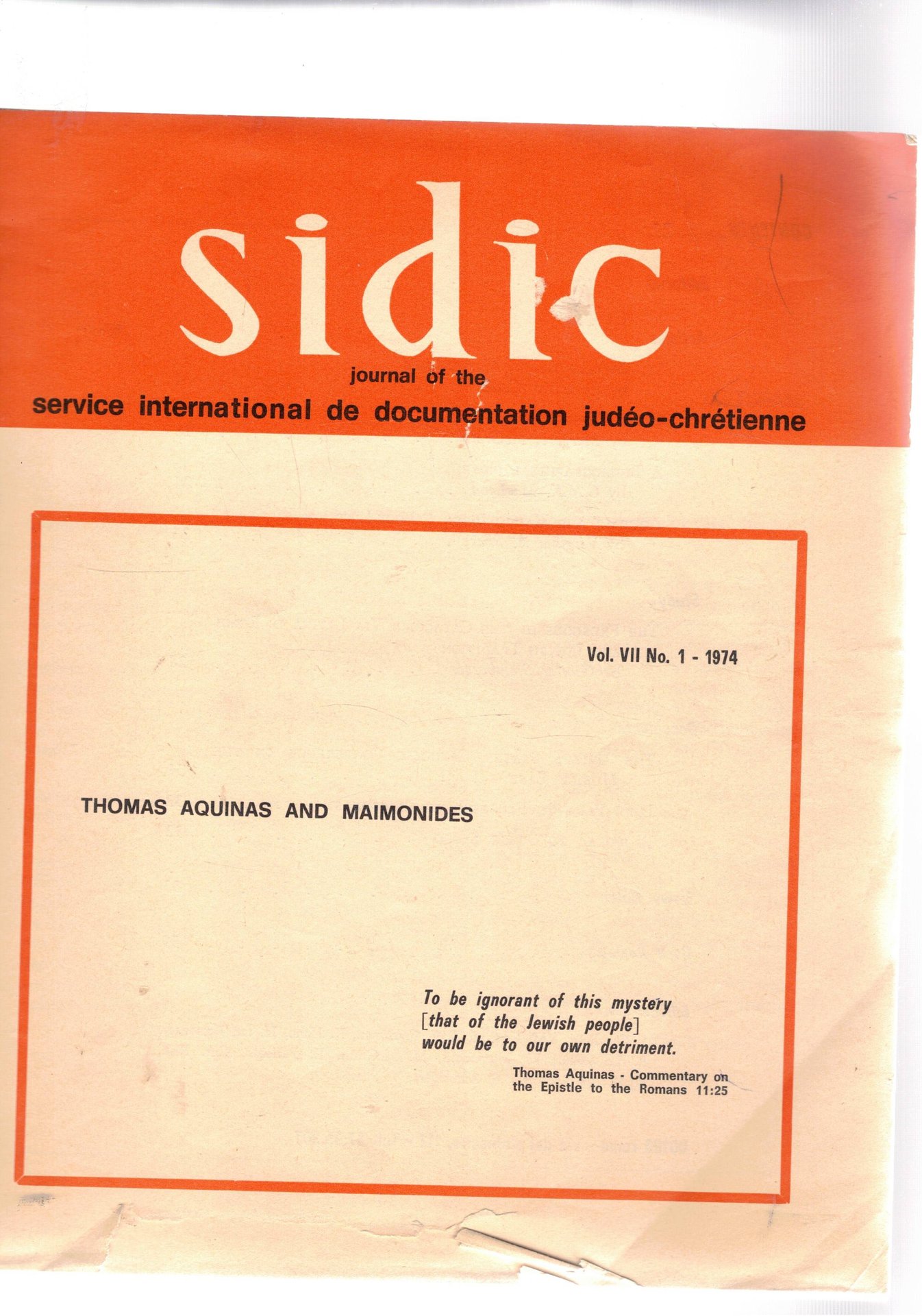 Thomas Aquinas and Maimonides. n° 1 vol. VII del 1974. della pubblicazione Sidic journal of the service international de documetation Judéo-Chrétienne.
