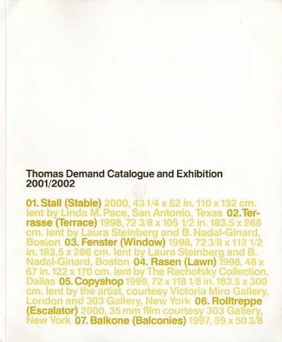 Published on the occasion of the 2001 exhibition Thomas Demand, curated by Dean Sobel, at the Aspen Art Museum (also traveled to De Apel Foundation, Amsterdam, ArtPace, San Antonio, Texas and SITE Sante Fe, Sante Fe, New Mexico). From the publisher: "German photographer Thomas Demand (b. 1964) is one of the most highly acclaimed artists of his generation. Like many of his contemporaries, his work investigates the nature and process of photography while exploring the role of the media in our culture. Demand begins his process with images of highly charged locations, usually interiors. He obtains these images from a variety of sources, including newspapers, the Internet, and even his own memory. Demand then builds life-size paper and cardboard models of these places, which in turn become the "subjects" of his large-scale photographs. While the artificiality of these images may not be immediately apparent, upon detailed examination, one can see that details are missing (like light switches), and everything has a hint of peculiarity. In describing his work, Demand has said, "The surroundings that I portray are, for me, something untouched - a utopic construction. No traces of use are visible on their surfaces, and time seems to have come to a stop." — Testi: Sobel Dean. F.to: 24x30; pagg. 80; COL; rileg. brossura. Editore: Aspen Art Museum, Aspen, 2001.