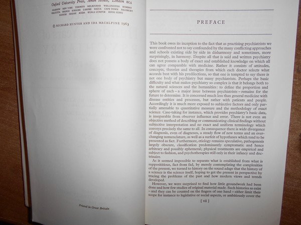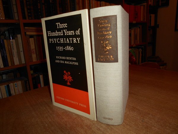 RICHARD HUNTER. IDA MACALPINE. London, Oxford University Press, 1963. Three Hundread Years of PSYCHIATRY 1535 - 1869. In-8°, tela con titolo in oro al dorso, sovracopertina a col. xxvi, 1107 pp. In ottimo stato di conservazione con numerose illustrazioni n.t. Uff. C . IV - 2