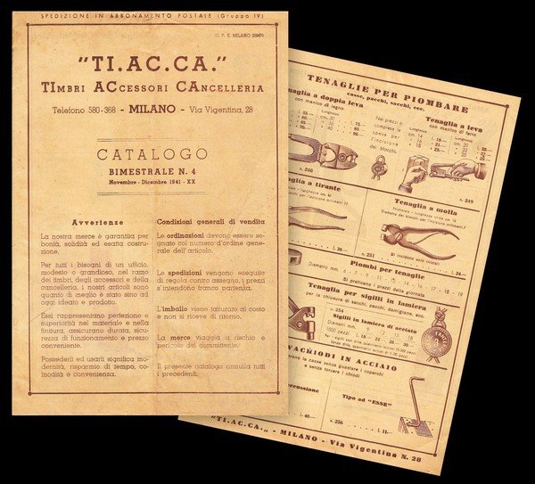 TI. AC. CA. Timbri, Accessori, Cancelleria, Milano. Catalogo bimestrale n. 4. Novembre, dicembre 1941.