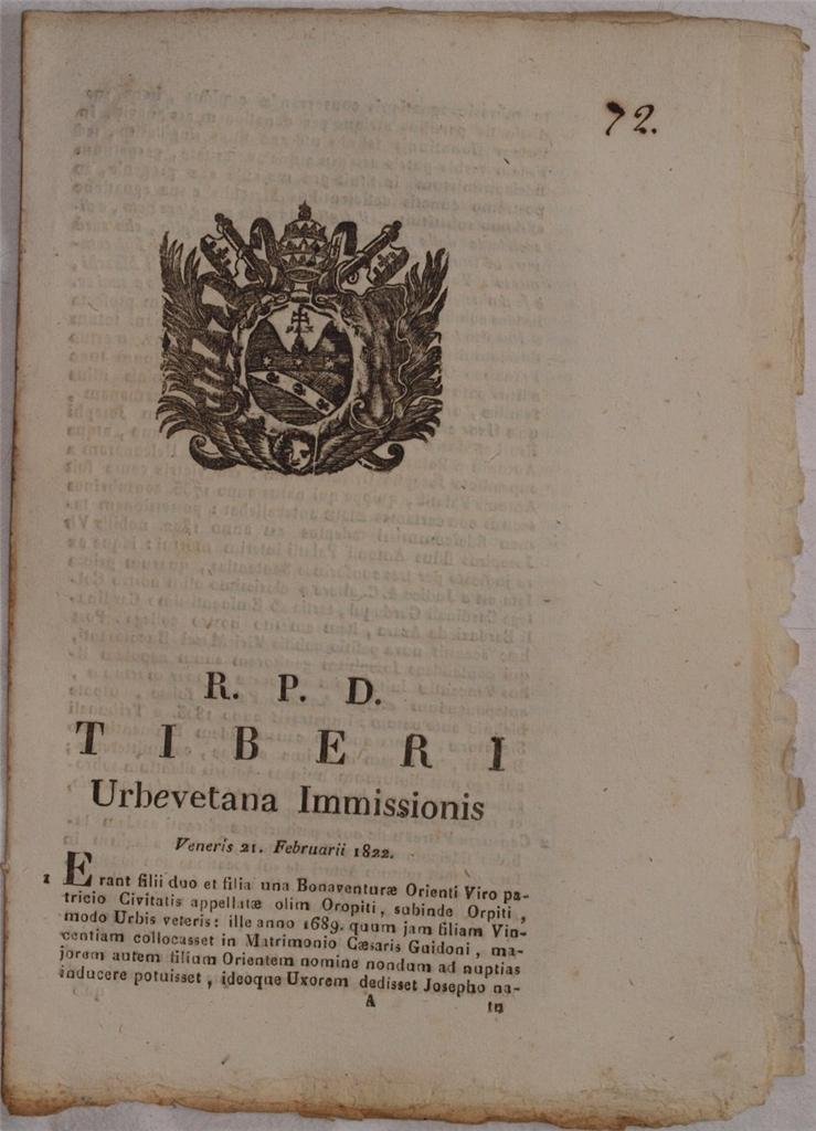 In 4. Dim. 29x22 cm. Pp. (6). Interessante pubblicazione del 1822, una sentenza del Tribunale della Sacra Rota del 21 Febbraio 1822 per una causa nella diocesi di Orvieto. Si tratta della causa per la donazione dei beni da parte di Bonaventura Orienti al primogenito con fideicommissa per donare i beni ai suoi futuri figli. Orienti possedeva altre due figlie femmine una delle quali si sposò con Cesare Guidoni al momento della donazione. In buone condizioni. Copertina assente. Legatura assente. All'interno le pagine si presentano in buone condizioni con rare fioriture. Interesting pamphlet of 1822, a sentence of the Trial of Sacra Rota for a trial of 21st of February 1822 in the diocesis of Orvieto. It is the trial for the for the donation of goods by Bonaventura Orienti to his first son with fideicommissionary to donate his goods to his future sons. Orienti had two daughters one of them married with Cesare Guidoni when her father donated the goods to her brother. In good conditions. Cover is missing. Binding is missing. Inside pages are in good conditions with foxings and yellowings.