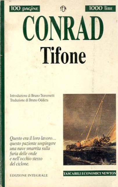 Ed. integrale. 96 p. ; 21 x 13 cm. 100 pagine 1000 lire, 218. «Tifone» è un racconto dello scrittore Joseph Conrad, è una classica storia di mare, basata probabilmente sulla reale esperienza di Conrad come marinaio e, probabilmente, anche su una vera e propria disavventura vissuta a bordo del vero piroscafo John P. Best. Il lungo racconto descrive le gesta del capitano Tom MacWhirr nell'affrontare un tifone tropicale al comando del piroscafo battente bandiera siamese Nan-Shan, col suo carico umano di coolies cinesi diretti verso la terra natia. Sono presenti altri gustosi personaggi di contorno come il primo ufficiale Jukes e Solomon, il motorista capo. Il romanzo è ambientato in nave fra il diciannovesimo ed il ventesimo secolo. MacWhirr, uomo stolido, timido e semplice, ignorato dalla sua famiglia, sfruttato dalla moglie e deriso dal suo equipaggio, rifiuta testardamente di cambiare rotta per evitare il sopraggiungere di un tifone.Titolo originale dell'opera: «Typhoon». Traduzione di Bruno Oddera. Brossura editoriale, coperta in cartoncino flessibile plastificato lucido, illustrata a colori. Qualche segno del tempo alla coperta e alle pagine interne (ingiallimento) per il resto libro accettabile. Codice libreria 5360.