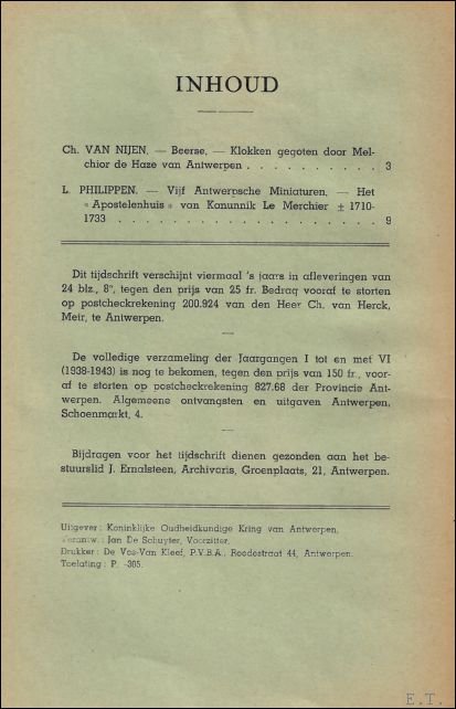 Paperback, 30 pagina's, NL, 240 x 160 mm, met illustraties in z/w Uitgegeven door de Commissie voor Geschiedkundige en Folkloristische Opzoekingen der provincie Antwerpen. Verschillende losse jaargangen of afleveringen. Per stuk,