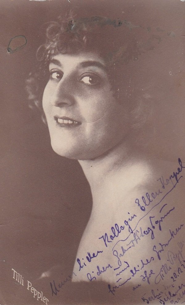 Seltene Porträtpostkarte von ca. 1920 mit einer Photographie von Tilli Peppler, die ihre eigene Porträtkarte mit Geburtstagsgrüßen für eine Kollegin (Ellen Koppel) versah und auch datierte (1922). Rückseitig findet sich ein (unleserlicher) Hinweis auf das Photoatelier (Berlin-Schöneberg). Sehr wahrscheinlich war die porträtierte Tilli Peppler als Schauspielerin am einstigen Central-Theater in Berlin (Luisenstadt) tätig und gehört heute zu den vergessenen Künstlern im Berlin der 1920er Jahre.