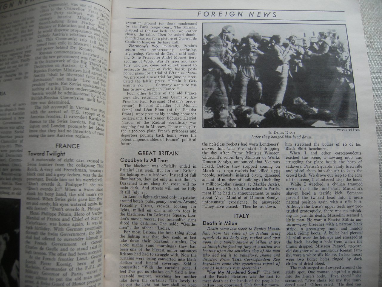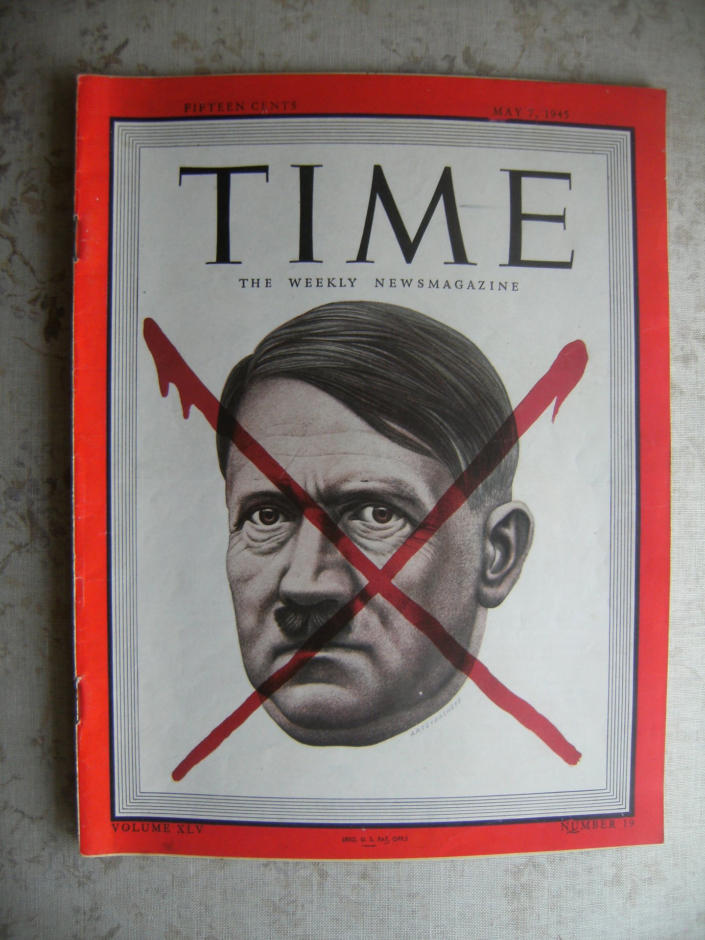 Lo storico numero di "Time" del 7 maggio 1945, recante in copertina l'immagine di Hitler cancellato da una X rossa. Comprende la cronaca degli ultimi giorni di Hitler e Mussolini. Pag. 104 con molte foto e illustrazioni in nero e a colori. Esemplare molto buono, senza segni o sottolineature. Raro.