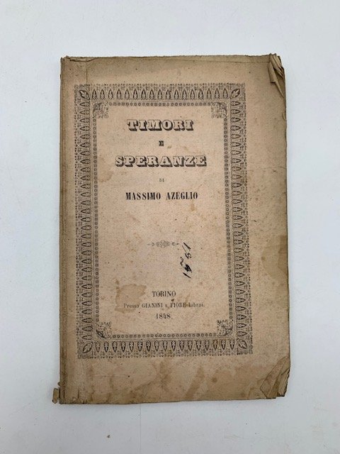 In 16 (cm 12 x 18,5), pp. 56. Brossura editoriale con qualche alone ai piatti. Gora alle pagine 4, 5, 6 e al margine bianco degli ultimi fogli, piu' ampia e diffusa alle pp. 7-8. Brossura editoriale. Edizione originale di questo opuscolo di d'Azeglio "franca dichiarazione di ideali moderati e riformistici. Ma e' anche un attacco, un duro ed impietoso attacco a Mazzini; Azeglio lo giudica senza simpatia, senza generosita'." (Marziano Brignoli, "Massimo d'Azeglio. Una biografia politica, 1988, p. 168).