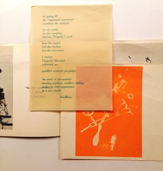 Quartino sciolto oblungo (25x32) con tavole fotografiche stampate b/n all'interno. Contiene 1 foglio in pergamino (28x21) con il testo di Willem Sandberg e una stampa in arancione su cartoncino (25x32) Catalogo / invito della mostra tenutasi alla Galleria Iolas di New York nel 1961 in collaborazione con la Dwan Gallery di Los Angeles (bc)
