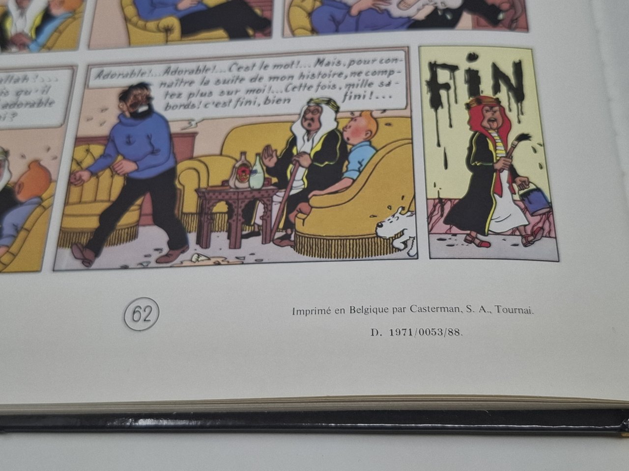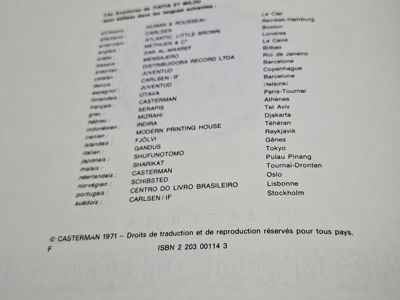 Fumetto cartonato, a colori, appartenente alla serie 'les aventures de TINTIN et MILOU'. Imprimé en Belgique. In lingua francese. Formato: 23 x 30,5 cm circa. 62 pagine. Stato di conservazione: Ottimo. privo di firme di appartenenza, abrasioni, o altri difetti. Copertina editoriale cartonata rigida, illustrata a colori.