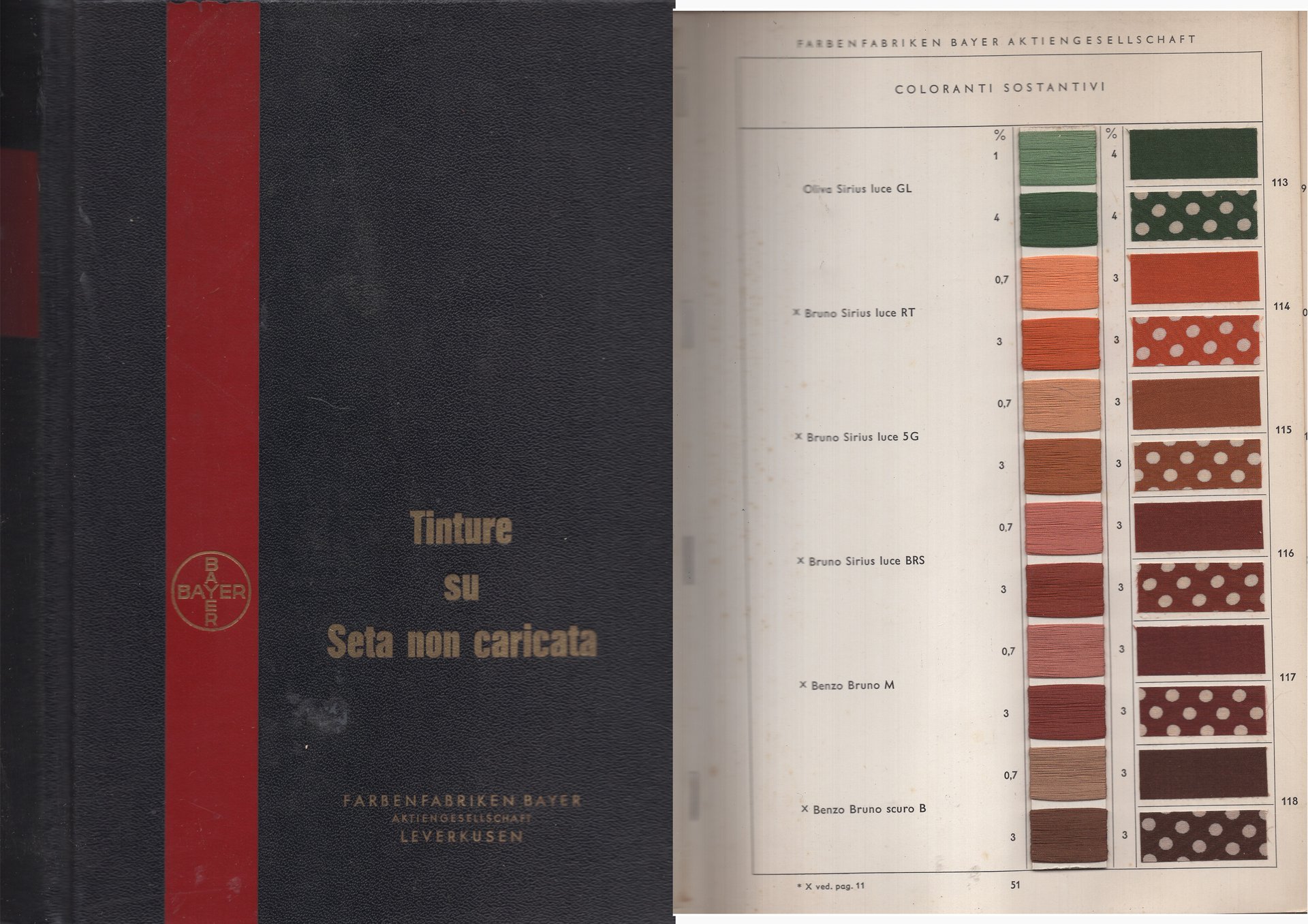 Cartella Le 406i che illustra attraverso piccoli campioni su filato e su tessuto i coloranti più adatti per la seta e la loro solidità rispetto a vari agenti. Contiene una aggiunta rilegata a parte