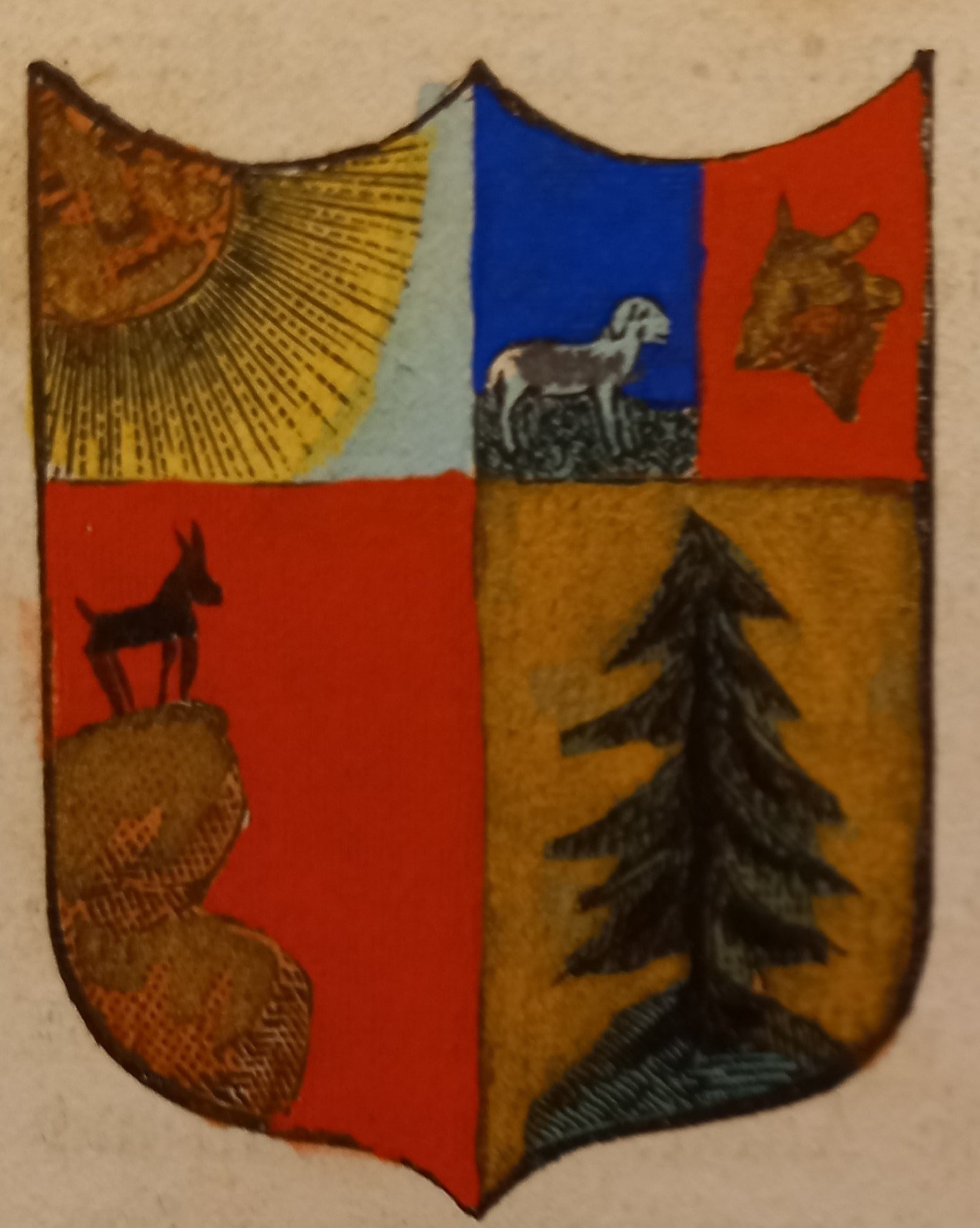Piccolo stemma comunale colorato a mano d’epoca (cm. 3,8 x 3,2 ca.). Stralcio dal Dizionario Corografico illustrato dell’Italia, edito a Milano nel 1868. Ogni stemma di questa raccolta è inserito in una o più pagine di testo con la descrizione della località, notizie storico - geografiche e statistiche (numero degli abitanti e degli elettori, guarnigioni della Guardia Nazionale, ecc.). Spesso il testo è redatto da studiosi locali o dai sindaci, con maggiori, interessanti notizie.