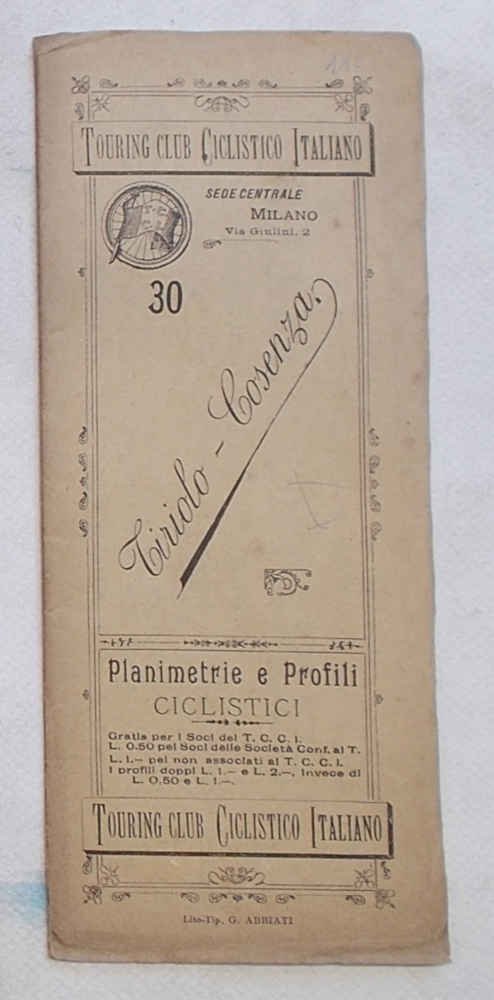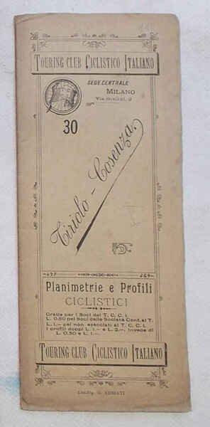 Tavola di 12 facciate di cm. 21,5 x 8,5 (perciò lunga cm. 102 circa). VG. ** Le "Planimetrie e profili ciclistici" del Touring Club Ciclistico Italiano sono una collezione di pubblicazioni che ha qualcosa, anzi è più esatto dire molto! di epico: i 57 itinerari, pubblicati in 51 fascicoli tra il 1896 e il 1901, Luigi Vittorio Bertarelli, il fondatore del T.C.I., se li è fatti tutti in bicicletta, appuntando ogni informazione utile su un taccuino. Ogni itinerario è descritto su una lunga tavola, che si svolge orizzontalmente e che è ripiegata in una copertina con titoli, fregi e piccolo stemma del T.C.C.I. La tavola presenta un profilo altimetrico a tre colori e la cartina dell'area, con il tracciato evidenziato in rosso. Il profilo, oltre alle quote, contiene l'indicazione delle distante, della qualità delle strade (polverose, discrete, buone.), delle tappe e altre notizie utili (sorgenti, "splendido panorama", hotel, ristoranti, servizi postali.).