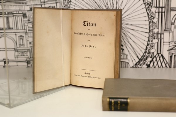 In-12, 14 x 9 centimetri circa, due volumi, "Il Titano" opera completa, pp. 551, 496. Reclam editore, Leipzig, senza data (primi del novecento). Legatura coeva in tela grigia, tassello al dorso con titolo e autore in oro. Leggero ingiallimento delle pagine, foxy, etichetta di biblioteca privata al dorso. Testo in tedesco. 14 x 9 cm approximately, two volumes, complete work, pp. 551, 496. Reclam publisher, Leipzig, undated (early twentieth century). Contemporary binding in gray canvas, label on the spine with title and author in gold. Slight browning of the pages, foxy, private library label on the spine. German text.