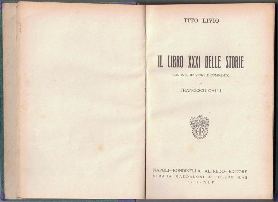 Tito Livio (Titus LIvius), Il Libro XXXI delle Storie, con introduzione e commento di Francesco Galli, Rondinella Alfredo Editore, Napoli 1931, pp. 250, cm 19, Testo in lingua latina con introduzione, commento e apparati in lingua italiana. Lievissime tracce d’uso alla legatura, qualche sporadico segnetto o annotazione a margine a lapis, qualche rara sottolineatura, minime fioriture, tenue brunitura della carta, per il resto bell’esemplare.