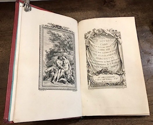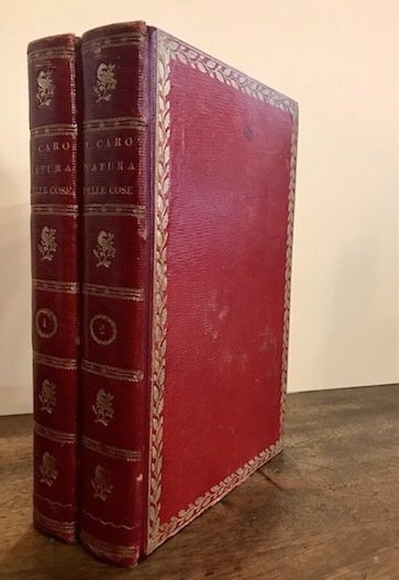8vo (cm. 27,6), 2 Voll.; 2 cc.nn., 243(1) pp.; da p. 245 a p. 543(1). Entrambi i volumi con antiporta e frontespizio calcografici f.t. (incisi da N.Le Mire e Aliamet su disegni di Ch.Eisen e Cochin). Sei tavole f.t. incise da Le Mire, Tardieu, Aliamet e Sornique su disegni di Cochin e Le Lorrain, 7 testatine e 5 cul-de-lampe (dei quali due a piena pagina) n.t. Eleganti legature coeve in marocchino rosso con fili, fregi e titoli impressi in oro al ds. Cornici fitomorfe ai piatti. Tagli dorati. Opera completa pur con alcuni errori di impaginazione da parte del legatore nel primo volume. Esemplare in ottimo stato di conservazione. Classica e apprezzata traduzione in volgare del ‘De Rerum Natura’ ad opera di Alessandro Marchetti, composta tra il 1664 ed il 1669 e per problemi di censura ecclesiastica pubblicata solo nel 1717. Brunet III, 1222 (’L’edition est fort belle’).