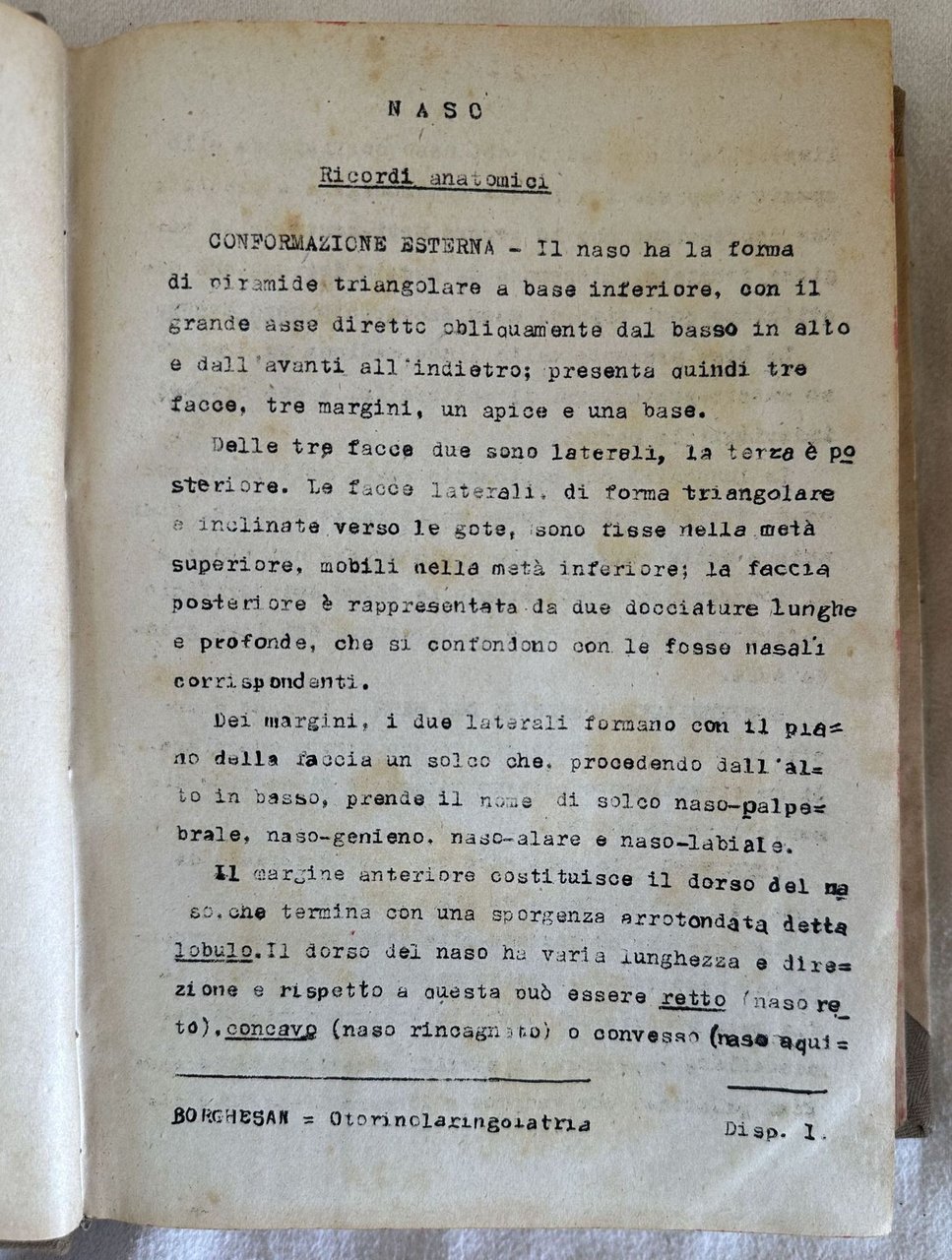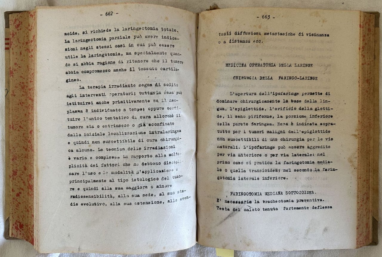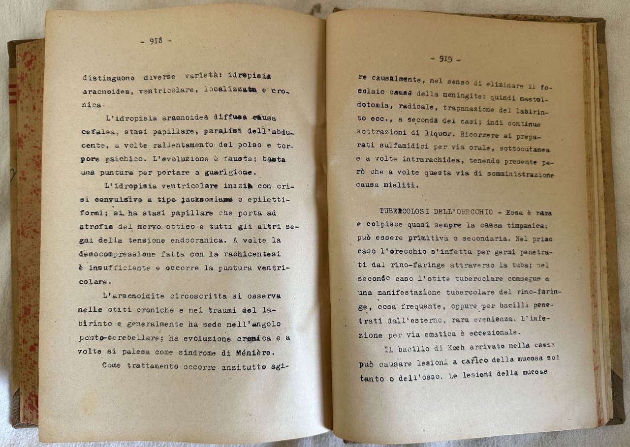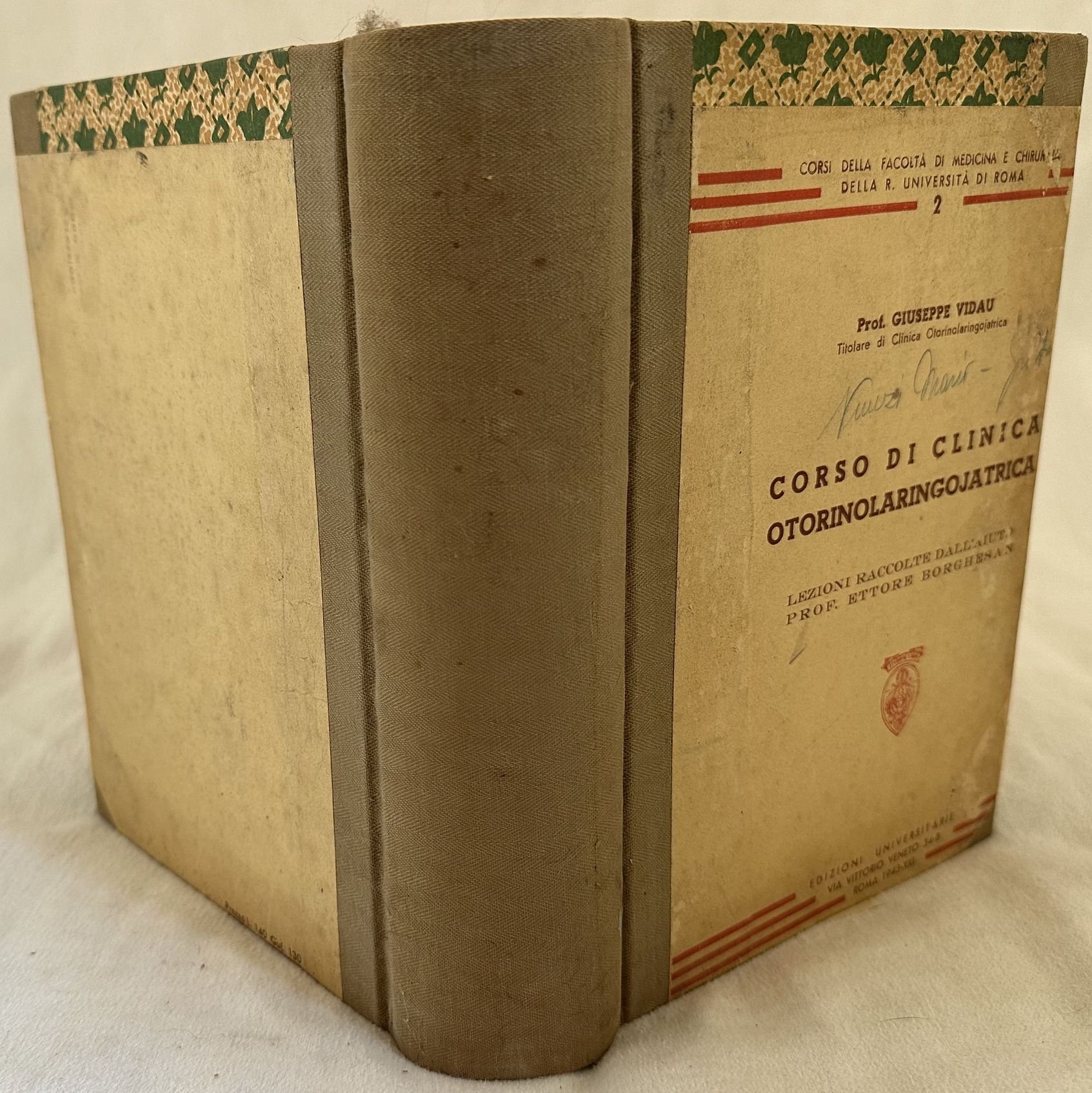 Rara raccolta di appunti delle lezioni di Clinica otorinolaringojatrica dettate nella Regia Università di Roma dal Prof. Giuseppe Vidau . Gli appunti sono stati redatti in copia battuta a macchina da scrivere. Lezioni raccolte dall'aiuto Prof. Ettore Borghesan. Firma in copertina. In ottime condizioni. Copertina cartonata editoriale in ottime condizioni con lievi usure ai margini e dorso. Legatura in buone condizioni. Pagine in ottime condizioni con rare fioriture. In 8. Dim. 24,5x19 mm. Pp. 962. Peso Kg. 1,400. Scarce collection of notes from the lessons of Clinics otorinolaringojatrica told in Regia Unviersity of Rome by Prof. Giuseppe Vidau . The notes have been written a typewritten copy. Lessons collected by the help teacher Prof. Ettore Borghesan. Signature in the cover. In very good conditions. Carton editorial cover in very good conditions lightly worn in the extremities. Binding in good conditions. Pages in very good conditions with occasional foxing. Reinforcement in the extremities of pag. 260 and 261 with light loss of text. In 8. Dim. 24,5x19 mm. Pp. 962. Weight Kg. 1,400.<BR><BR>