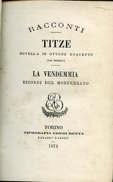 In-16°, pp. 235, (4), legatura coeva p. percallina verde con fregi ornamentali impressi a secco e titolo oro al dorso. Bell'esemplare. Il volume, assai poco comune, contiene alle pp. 1-210 la prima traduzione italiana di un lungo racconto storico dello scrittore tedesco Otto Roquette, 'Titze', e, alle pp. 211-235, lo scritto 'La vendemmia. Ricordi del Monferrato', dovuto a un non meglio conosciuto Pietro Grappoli (forse uno pseudonimo, data la natura dello scritto, improvvisazione narrativa sulle vendemmie monferrine). Otto Roquette (Krotoschin, Posnania, 1824- Darmstadt, 1896) fu professore all'Accademia Militare di Berlino e fecondo narratore, poeta e storico della letteratura.