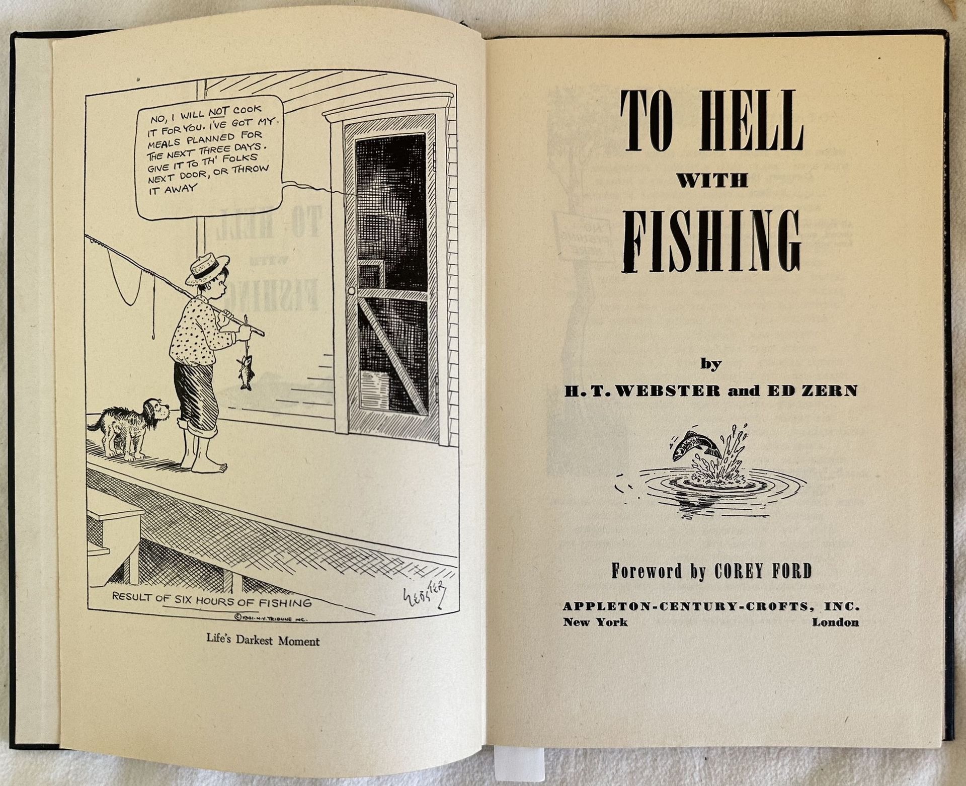 Edizione del 1945 di questo manuale di pesca sportiva di H. T. Webster ed Ed Zern. All'interno: come utilizzare i pesci morti, come acchiappare pesci con le mosche, come fare un torrente per le trote, perchè gli stupidi acchiappano più trote delle persone intelligenti, la natura non è naturale, pesca grossa, pesca occidentale, La verità su Izaak Walton ecc. Una vignetta umoristica a fronte di ogni testo. In ottime condizioni. Copertina cartonata editoriale in ottime condizioni con lievi usure marginali. Legatura in buone condizioni. Pagine in ottime condizioni. In 8. cm. 24x16. Pp. 86+(2). Edition of 1945 of this manual of sport fishing by H. T. Webster and Ed Zern. Inside: How to dispose of dead fish, ain's it the truth, How to catch fish with flies, How to wade a trout stream, Why dumb people catch more trout than smart people, How to tell fish from fishermen, Big game fishing, The Low down on Western Fishing, The truth about Izaak Walton ecc. A humour vignette in front of each text. In very good conditions. Carton editorial cover in very good conditions lightly worn in the extremities. Binding in good conditions. Pages in very good conditions.In 8. cm. 24x16. Pp. 86+(2).