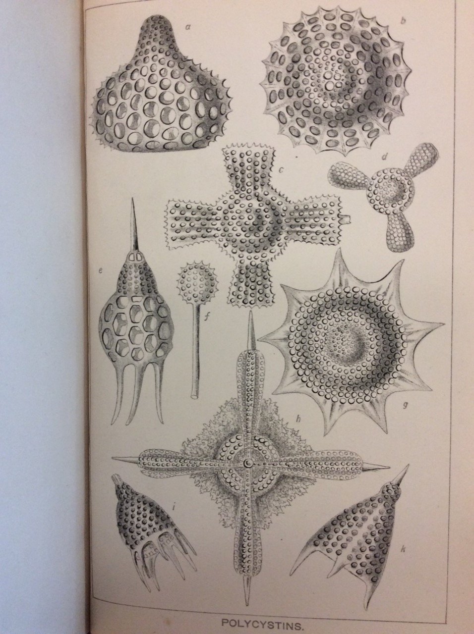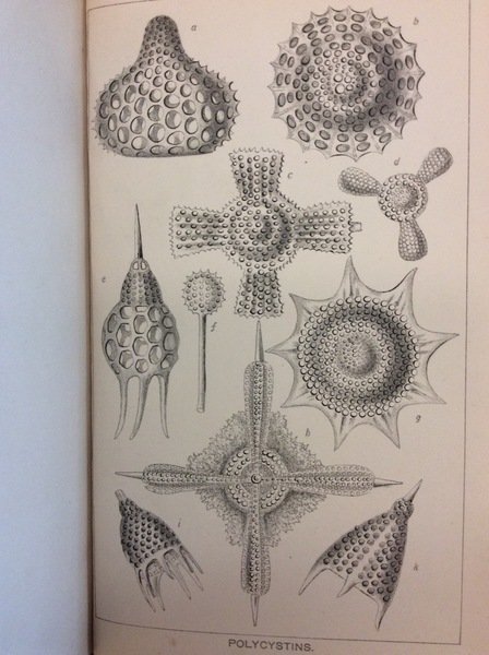 In-16 gr. (mm. 183x114), bella legatura in p. vitellino blu coevo, stemma entro cornice dorata, dorso a cordoni con ricca decoraz. e titolo oro su tassello ai riquadri, tagli marmorizzati. dentelles dorate ai risguardi, pp. VIII,373, con 70 figg. nel testo e 4 tavole fuori testo, ciascuna con num. figg., relative a fossili, conchiglie, spugne, coralli, etc. Chalk-makers, or Foraminifera - Lattice-workers, or Polycystina - Coral builders - Excavators, etc.. Ben conservato.