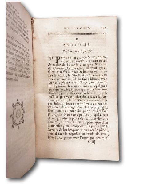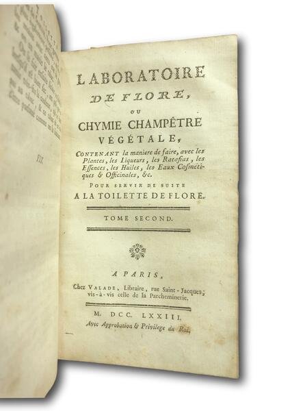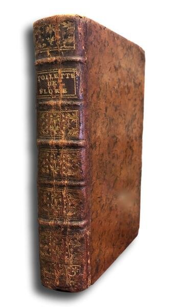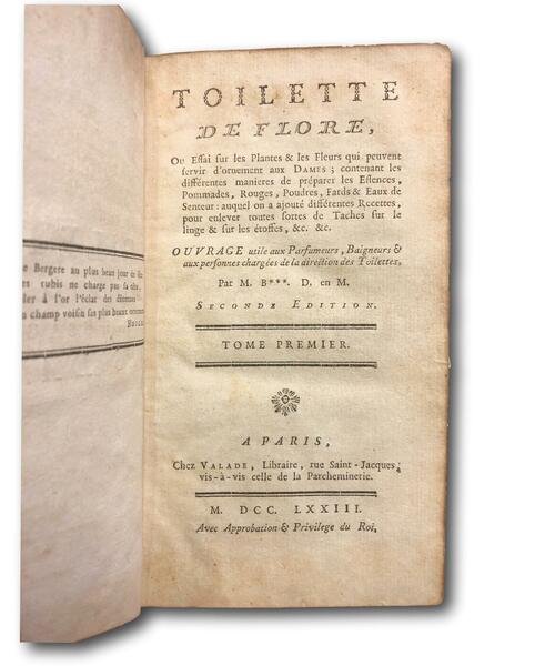 Paris, Chez Valade, 1773, Seconde Edition. Reliure de l'Žpoque, Basane marbrŽe, dos ˆ nerfs ornŽs, filets dorŽs sur les coupes, tranches rouges (petites traces d'usure), pp 224, 274. Toilette de Flore ou Essai sur les Plantes et les Fleurs qui peuvent servir d'ornement aux Dames; contenant les diffŽrentes mani�res de prŽparer les Essences, Pommades, Rouges, Poudres, Fards et Eaux de Senteur: auquel on a ajoutŽ diffŽrentes Recettes, pour enlever toutes sortes de Taches sur le linge, et sur les Žtoffes, etc. .Ouvrage utile aux Parfumeurs, Baigneurs et aux personnes chargŽes de la direction des Toilettes. Deux volumes in 12 reliŽs en un: Premiere partie contenant par ordre alphabŽtique les noms des Plantes & Fleurs qui peuvent convenir dans la Toilette des Dames, & qui entrent dans la plupart des Recettes comprises dans la seconde partie de cet Ouvrage. Seconde partie contenant la mani�re de faire avec les Plantes les Liqueurs, les Ratafiats, les Essences, les Huiles, les Eaux CosmŽtiques & Officinales, &c. Rarissime Edition Originale.