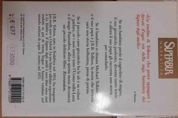 J. R. R. Tolkien, Roverandom. Le avventure di un Cane Alato, a cura di Christina Scull e Wayne G. Hammond, traduzione di Francesca Bandel Dragone, Rizzoli, Milano 2000, pp. 173, 4 c. di tavv. f.t. ill. b.n. e col., cm 20, br. ed. Collana Super Bur. Narrativa, n. S295. Titolo originale: Roverandom. Minima ingiallitura della carta, per il resto perfetto.