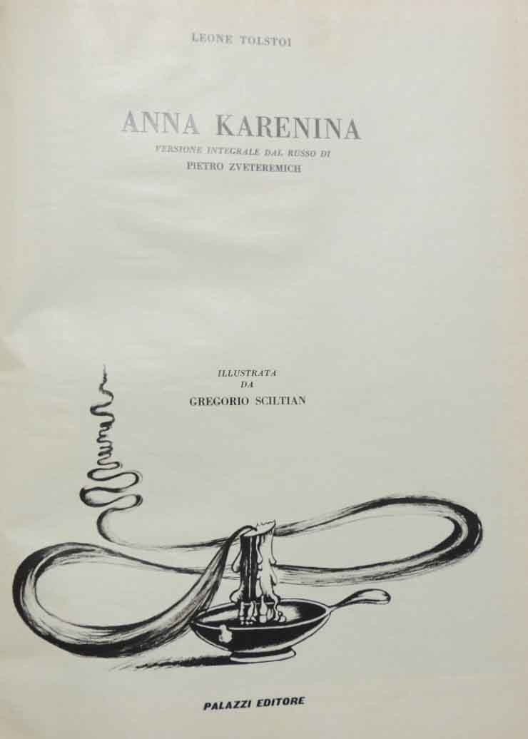 Leone Tolstoj, Anna Karenina, versione integrale dal russo di Pietro Zveteremich, illustrata da Gregorio Sciltian, Palazzi Editore, s. l. 1967-1968, pp. 411, ill. b.n. e col., cm 33, legatura in tela con titoli in oro al dorso e decorazioni in oro al piatto. Edizione fuori commercio pubblicata in 22 fascicoli, di cui 18 editi in allegato col settimanale Tempo dall’18 aprile al 7 novembre 1967, e 4 spediti ai collezionisti nel gennaio del 1968. L’opera è corredata 122 tavole a colori appositamente realizzate da Gregorio Sciltian. La traduzione è stata concessa dalla Casa Editrice Garzanti. Minima brunitura della carta, per il resto davvero ben conservato.
