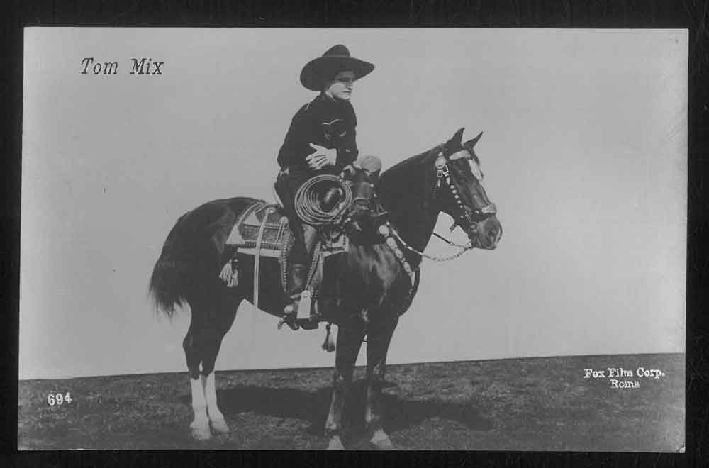<p>8,5x13,5 cm, fotografia in b/n con Tom Mix vestito da cow boy. La data è aprossimativa</p>