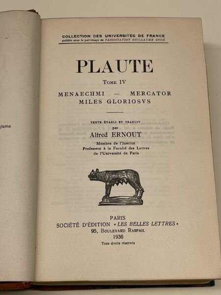 Les belles lettres 1936 Paris Les belles lettres 1936. In-8 relié demi-basane fauve, dos lisse avec titre doré. Texte établi et traduit par Alfred Ernoult. Dos insolé et frotté sinon intérieur propre