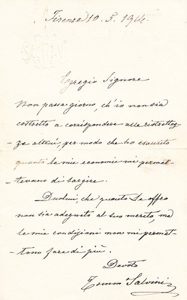 lettera manoscritta e firmata di Tommaso Salvini su carta intestata Salvini; lettera di 1 facciata datata Firenze, 10 maggio 1914 per un pagamento non adeguato; buon es.