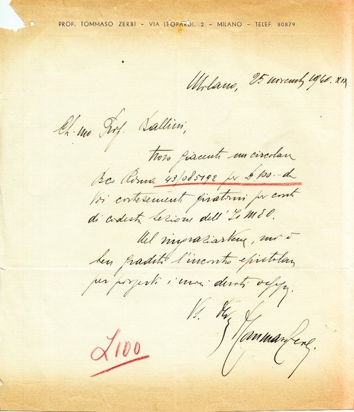 lettera manoscritta e firmata di Tommaso Zerbi di 1 facciata su carta intestata personale datata Milano, 25 Novembre 1940; lettera lievemente brunita con lievi usure ai margini; discreto es.