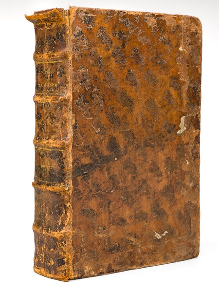 1 vol. fort in-folio reliure pleine basane marbrée, dos à 5 nerfs, s.n. [ Compagnie des Libraires ], Ludguni [ Lyon ], 1586, 381-621-315 pp. ; Titre complet : Tomus VI Operum D. Aurelii Augustini Hipponensis Episcopi, continens [ ta polemika ] Hoc est, Decertationes adversus haereses, praecipue Iudaeorum, Manichaeorum, Priscillianistarum, Origenistarum, Arrianorum, & Ioviniani ; nunc multis in locis summo stidop emendatus, per Theologos Lovanienses [ Suivi de : ] Tomus VII Operum D. Aurelii Augustini Hipponensis Episcopi, continens Reliquam Partem [ Ton polemikon ] in alias duas divisam, quarum priore adversus Donatistas, posteriore contra Pelagiano dimicat. Una cum appendice pseudepigraphorum. Nunc demum post varias editiones ad complurium MS. fidem à non paucis mendarum milibus incredibili labore expurgatus: id quod ex subiectis ad calcem Castigationibus & Scholiis facile cognosci poterit [ Suivi de : ] Annotationes in Tomum VIII B. Augustinii Hipponensis Episcopi Quibus castigationum ratio varietasque lectionum indicatur, res memoratu dignae observantur, obscuriora difficilioraque loca explicantur & illustrantur Ce volume réunit les tomes 6 et 7 et les annotations aux tomes 7, de l'édition établie par Thomas Gozaeus et Jean Molanus à partir de l'édition publiée à Anvers par Christophe Plantin en 1576-1577. On reconnaît publié la marque au Lion et aux Abeilles de la "Compagnie des libraires" de la Ville de Lyon avec leur devise "De forti dulcedo" (Baudrier, VI, 284). Etat satisfaisant (forts accrocs en coiffe, reliure frottée avec mq. de cuir au second plat, qq. mouill., travail de vers sur 40 ff. affectant le texte sur 20 ff., petite piqûre de vers sur affectant parfois qq. lettres sur la dernière partie du volume, ex-libris "Collegii Societatis Jesu Aginnensis Catal. Inscriptus" et ex-libris "Salvatoris"). Le collège des Jésuites d'Agen fut fondé en 1591 (4 ans après l'impression de cet ouvrage) ; il sera évacué le 1er août 1762.