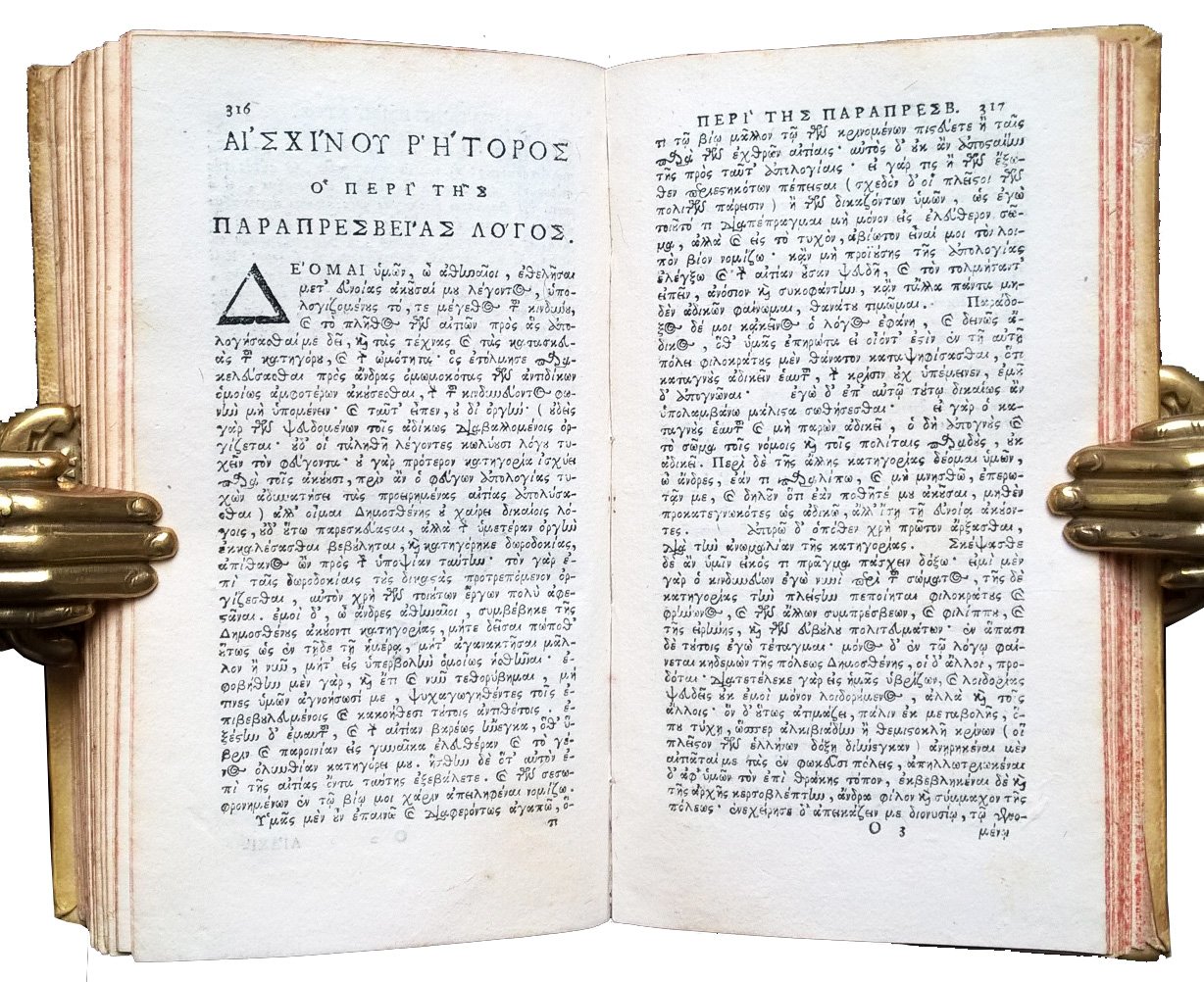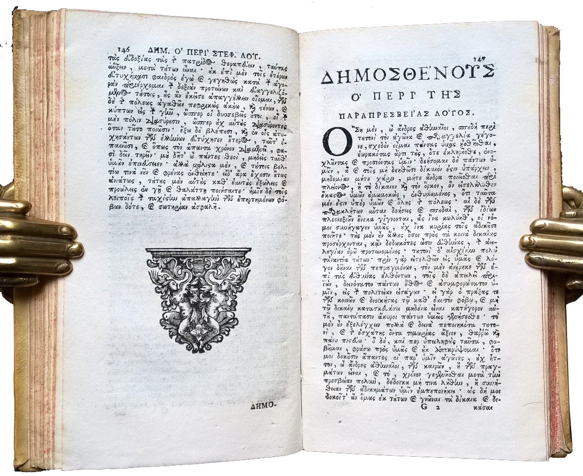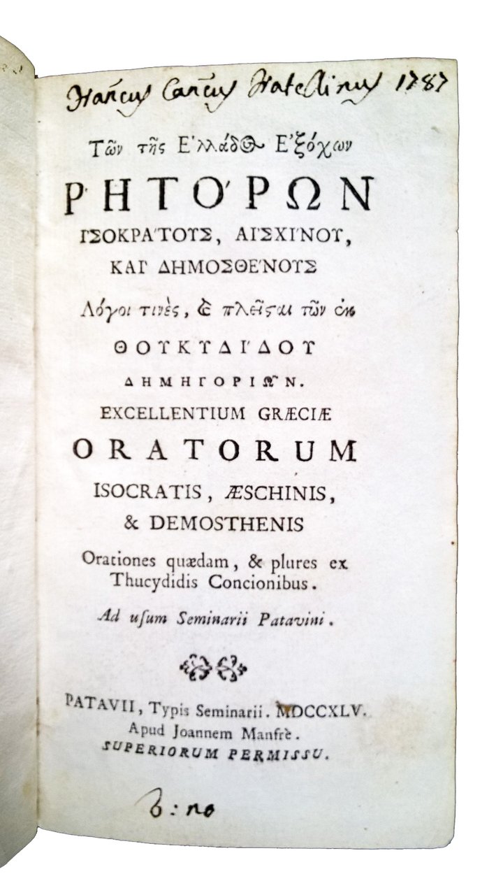 in-12°, 160x90 mm, leg. coeva rigida in piena pergamena, titolo manoscritto al dorso, tagli spruzzati di rosso; pp. 382, [2]. Frontespizio a caratteri neri in Greco ed in Latino. Iniziali xil. alla prefazione ed all'inizio del testo. Finalini xil. Testo integralmente in Greco, preceduto da una introduzione in Latino dell'Editore. Raccolta di famose orazioni e discorsi dei grandi oratori greci Isocrate, Eschine, Demostene e Tucidide. Prov.: Firma di appartenenza al frontespizio (Franciscus canonicus Fratellinus 1787). Rif.: IT\ICCU\TO0E\031941. OCLC, 849215260. Cond.: Lievi tracce d'uso alla legatura (piccole macchie). Esemplare molto buono. Peso: 265 g.