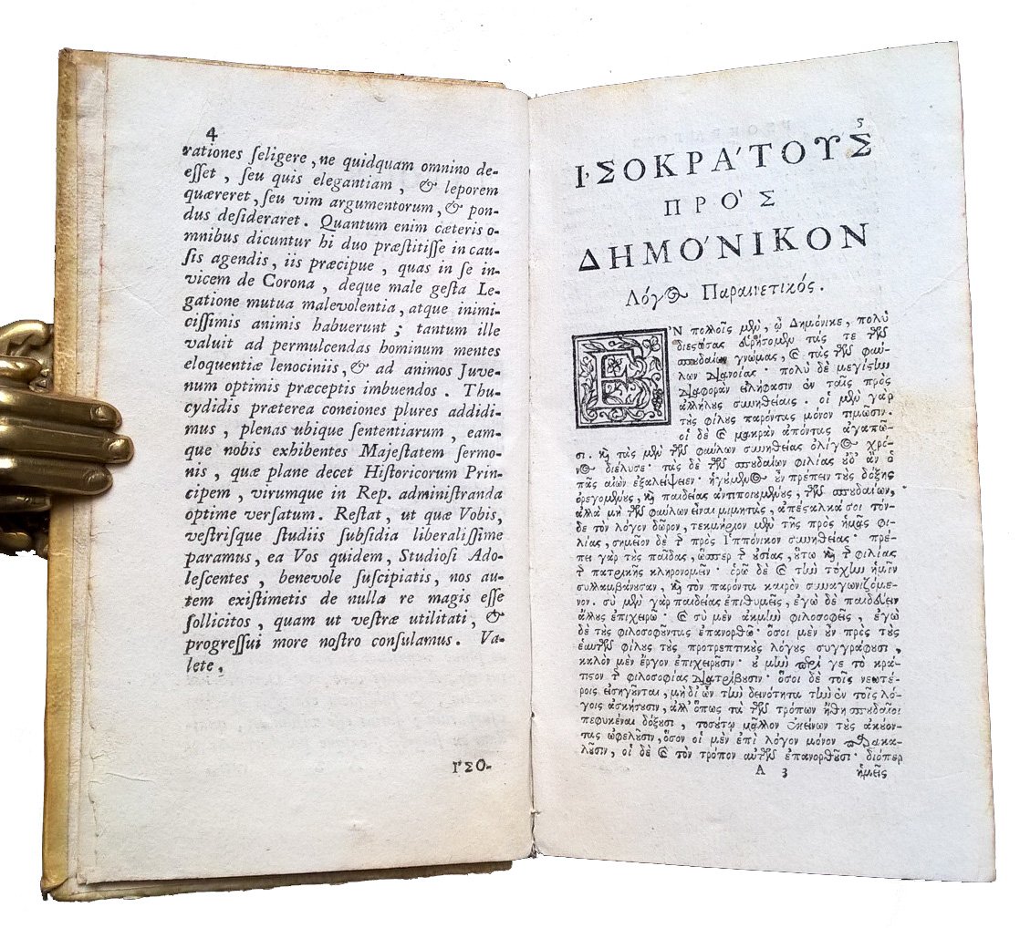 Ton tes Ellados exochon rhetoron Isokratous, Aischinou, kai Demosthenous Logoi tines, kai pleisai ton ek Thoukydidou Demegorion. Excellentium Graeciae Oratorum Isocratis, Aeschinis, & Demosthenis Orationes quaedam, & plures ex Thucydidis concionibus.