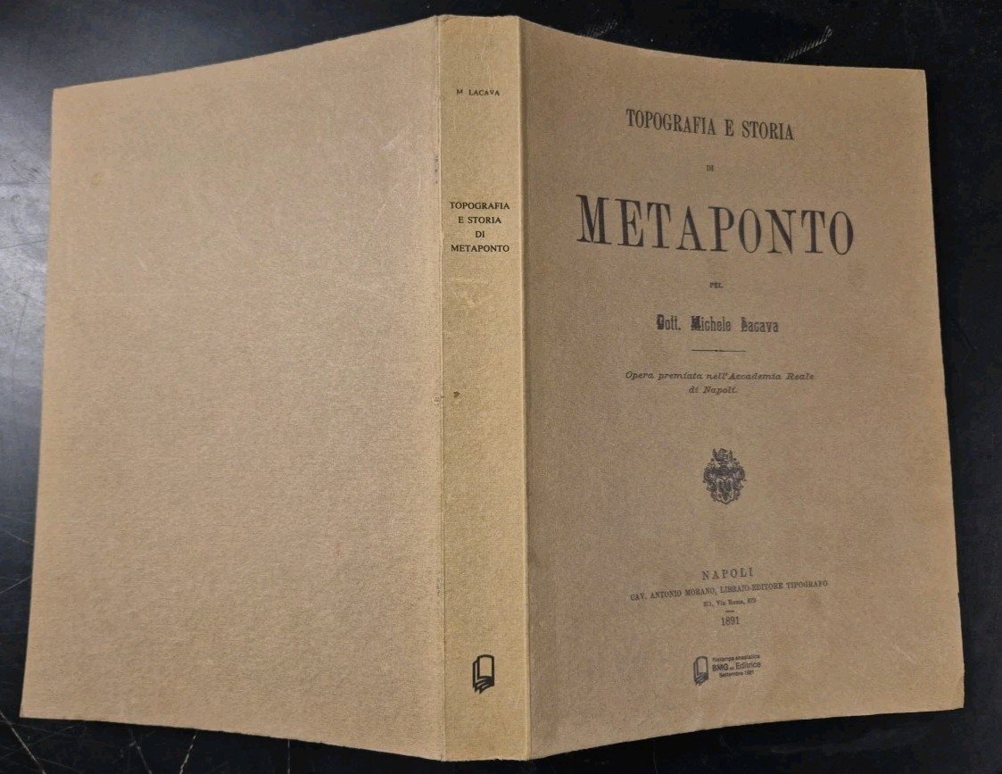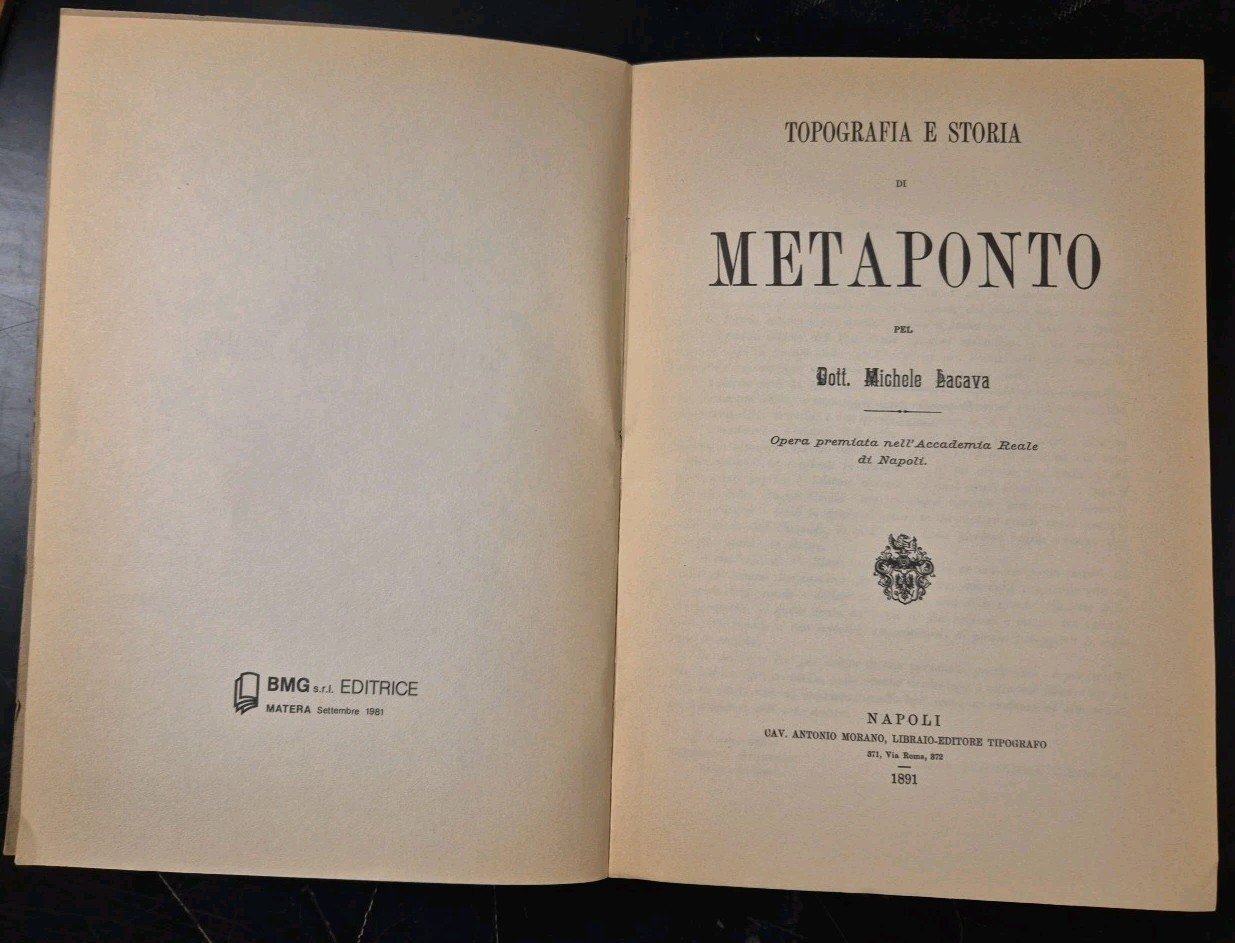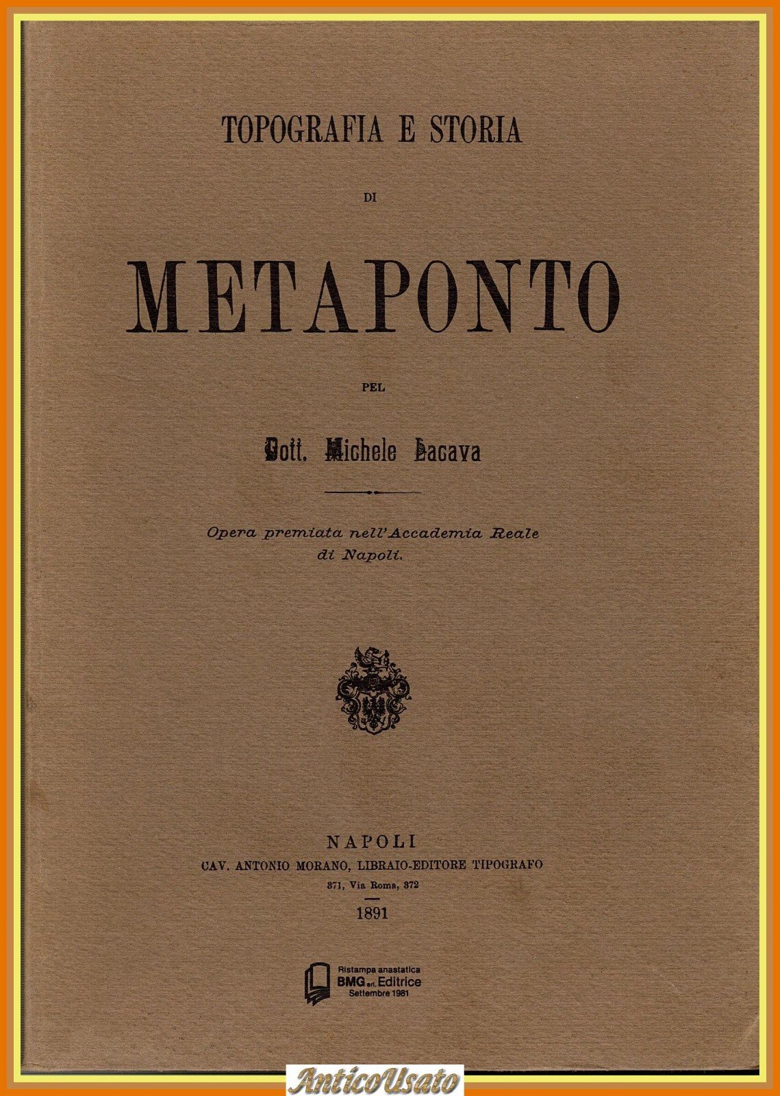 TOPOGRAFIA E STORIA DI METAPONTO del Dottor Michele Lacava. opera premiata nell'Accademia Reale di Napoli. Copia anastatica dell'originale pubblicata da Antonio Morano nel 1891.BMG editrice, 1973. 395 pagine, numerose fotografie in bianco e nero fuori testo. Copertina editoriale in brossura. Stato di conservazione: molto buono (pagine ingiallite) Libro usato saggistica storia locale archeologia
