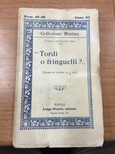 Bizzarria comica in 3 atti. Napoli. Pierro 1894, 16°, pp. 80. Exlibris. Bross. edit. con bruniture sparse. N. 25-28 della collana.