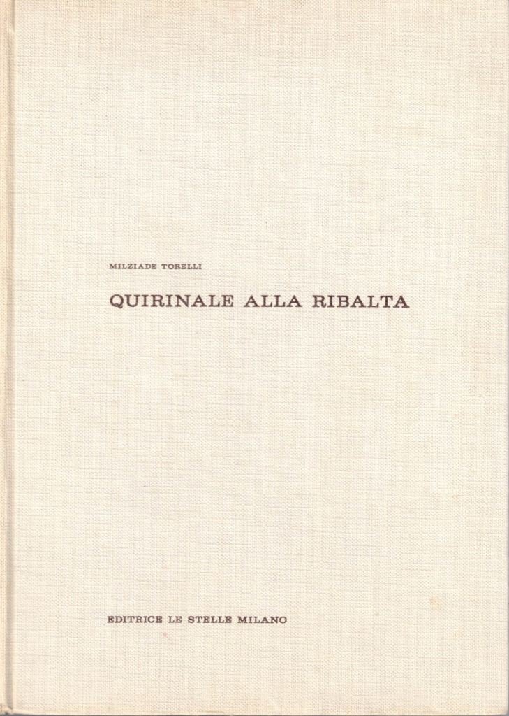 Milziade Torelli, Quirinale alla ribalta, Editrice Le Stelle, Milano 1960, pp. 175, ill. b.n., cm 25, cart. ed. con titoli al dorso e al piatto. Monografia sul presidente Giovanni Gronchi. Al frontespizio, timbro: Società Dante Alighieri – Sede Centrale – Dono. Lievi tracce d’uso alla legatura, minime fioriture, per il resto molto ben conservato.