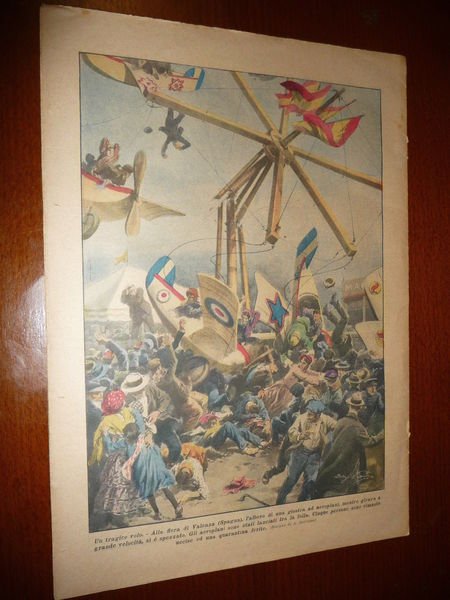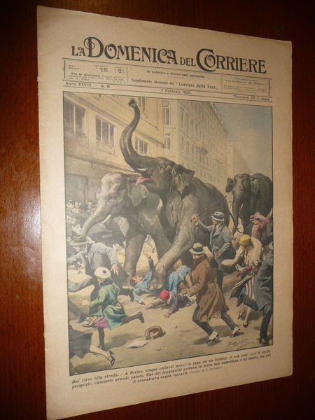 DESCRIZIONE: Domenica del Corriere, Milano, Anno 13 n. 28 (9 luglio 1911). COPERTINA: A Torino cinque elefanti impauriti da un bulldog scappano dal circo per finire nelle vie della città. RETRO: A Valencia (Spagna) l'albero di una giostra cade, finendo tra la folla, cinque persone uccise e 40 feriti. La Domenica del Corriere è stato un popolare settimanale italiano fondato a Milano nel 1899 e chiuso nel 1989. Apparve per la prima volta nelle edicole l'8 gennaio 1899 come supplemento illustrato del Corriere della Sera. Stampata in grande formato (sul modello del domenicale La Tribuna illustrata), aveva 12 pagine e veniva distribuita gratis agli abbonati del Corriere, oppure si poteva acquistare in edicola per 10 centesimi. La prima e ultima di copertina erano sempre disegnate. Il Corriere si avvaleva di un giovane disegnatore, Achille Beltrame, allora sconosciuto, a cui veniva affidato in ogni numero il compito di rendere con la sua tavola il fatto più interessante della settimana. Dopo la sua morte nel 1945, fu sostituito da Walter Molino che, come il suo predecessore, firmò memorabili copertine. A differenza dei settimanali dell'epoca, la Domenica del Corriere diede ampio spazio alle fotografie e ai disegni, e questo fu uno dei motivi del suo successo. CONDIZIONI: Buone senza spillette, senza sovracc. azzurrina, proveniente da rilegatura. PESO / WEIGHT: 45 gr. without package.