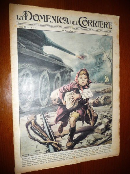 DESCRIZIONE: Domenica del Corriere, Milano, Anno 58 n. 47 (18 novembre 1956). COPERTINA: Invasione delle truppe sovietiche in Ungheria, fuga dei bimbi verso la frontiera austriaca. RETRO: A Torino Mirafiori due operai rimangono uccisi precipitando nella ciminiera (Ampelio Rsato e Pietro Ghirardello) ed altri quattro riescono miracoloamente a salvarsi. La Domenica del Corriere è stato un popolare settimanale italiano fondato a Milano nel 1899 e chiuso nel 1989. Apparve per la prima volta nelle edicole l'8 gennaio 1899 come supplemento illustrato del Corriere della Sera. Stampata in grande formato (sul modello del domenicale La Tribuna illustrata), aveva 12 pagine e veniva distribuita gratis agli abbonati del Corriere, oppure si poteva acquistare in edicola per 10 centesimi. La prima e ultima di copertina erano sempre disegnate. Il Corriere si avvaleva di un giovane disegnatore, Achille Beltrame, allora sconosciuto, a cui veniva affidato in ogni numero il compito di rendere con la sua tavola il fatto più interessante della settimana. Dopo la sua morte nel 1945, fu sostituito da Walter Molino che, come il suo predecessore, firmò memorabili copertine. A differenza dei settimanali dell'epoca, la Domenica del Corriere diede ampio spazio alle fotografie e ai disegni, e questo fu uno dei motivi del suo successo. CONDIZIONI: Buone con spillette, senza sovracc. azzurrina, alcuni strappetti. PESO / WEIGHT: 102 gr. without package.
