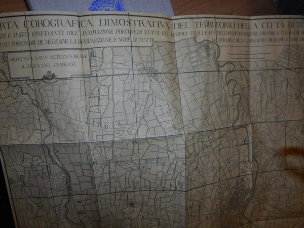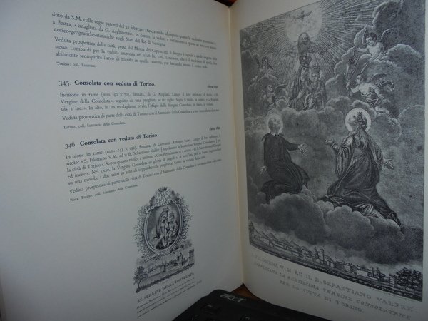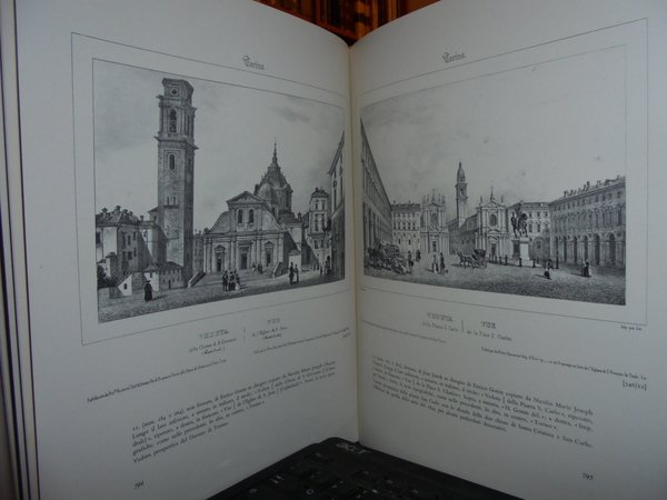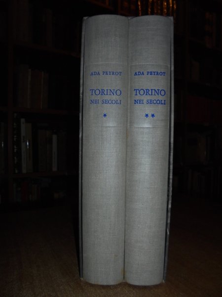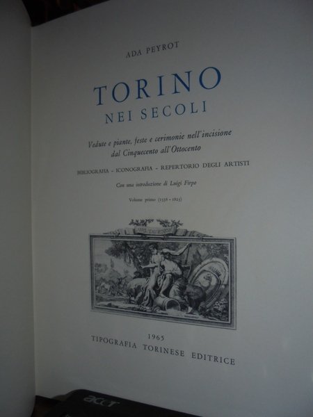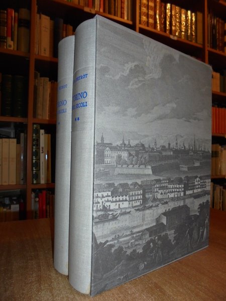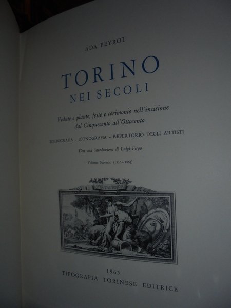 PEYROT, ADA. Tipografia Torinese Editrice, 1965. TORINO NEI SECOLI. Vedute e piante, feste e cerimonie nell'incisione dal Cinquecento all'Ottocento. Bibliografia - Iconografia - Repertorio degli artisti. Con una introduzione di Luigi Firpo. xxvi, 2 volumi in-4° grande tela edit. con impressioni a secco sui piani e titoli ai dorsi. Numerazione continua per un totali di 943, (4) pp. con innumerevoli illustrazioni in bianco e nero nel testo. In fine nell' apposita tasca è presente la carta corografica dimostrativa del territorio di Torino appartenente alla << Guida alle Cascine e Vigne. >> di Giovanni Amedeo Grossi. Il cofanetto che custodisce i 2 volumi è in m-tela illustrata. Edizione in mille esemplari numerati. Es. n° 898. Come nuovo. Cas.