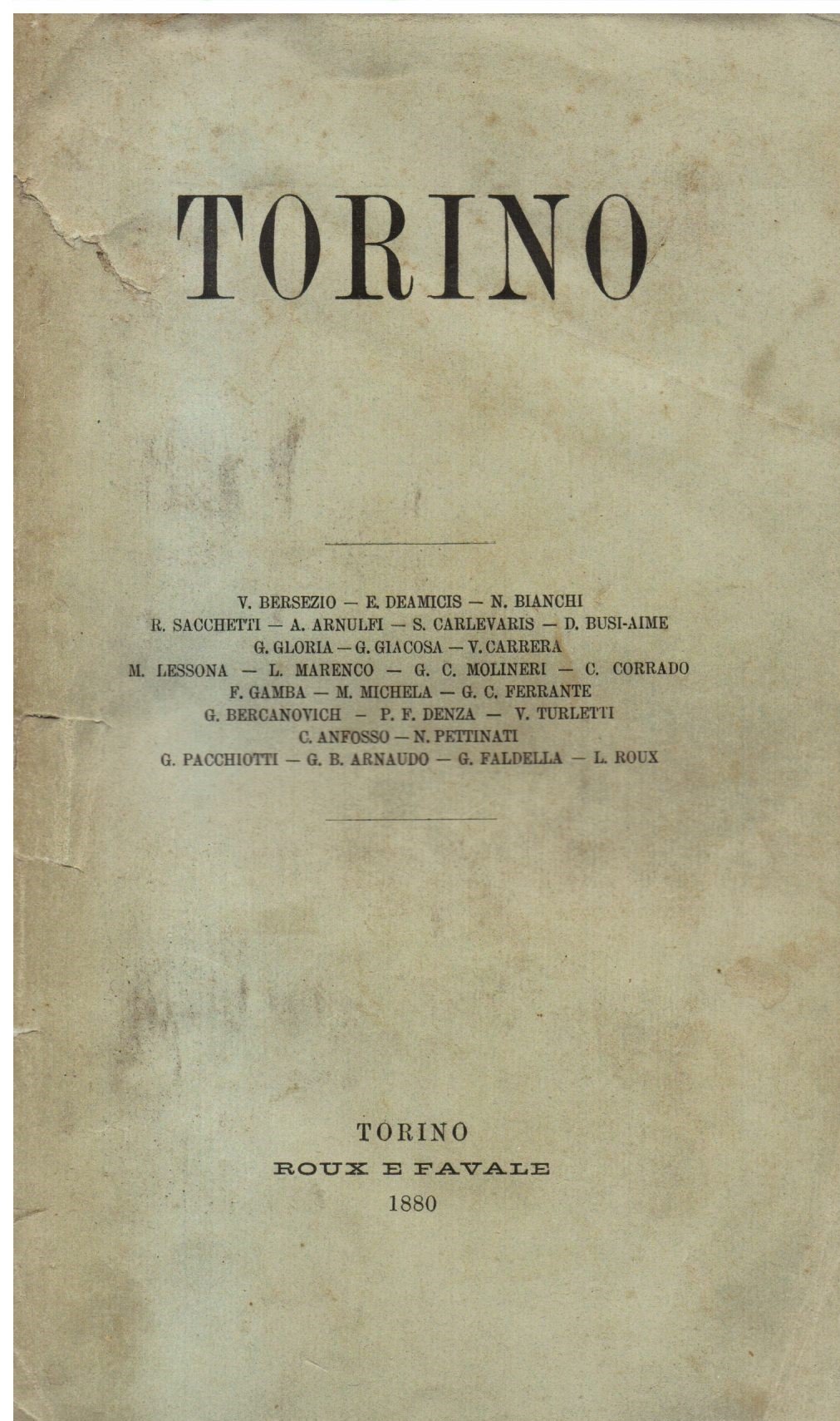 In-8° (cm 24.5x16) in brossura editoriale con titoli al piatto e al dorso. Pp. (2), 999, (1). Bell'esemplare. Fra gli autori dei testi figurano nomi di primissimo piano della vita culturale, scientifica e politica italiana del tempo,quali Vittorio Bersezio, Edmondo De Amicis, Giuseppe Giacosa, Nicomede Bianchi, Michele Lessona, Vittorio Turletti, Giovanni Faldella, Roberto Sacchetti, etc. Opera interessante e non comune, che in 26 capitoli, scritti dai principali scrittori piemontesi del tempo, ragguaglia sulla storia, l'arte, la topografia, i canti popolari, i circoli, i caffé, i teatri e i dintorni di Torino. Nel volume si citano e lodano tra l'altro il ponte Mosca, la Mole Antonelliana ancora in costruzione (allora raggiungeva i 110 metri) la stazione di Porta Nuova. Il volume venne stampato in occasione dell'Esposizione Nazionale di Belle Arti e del Congresso Artistico Nazionale del 25 aprile 1880. Fossati Bellani, II, n. 1812.