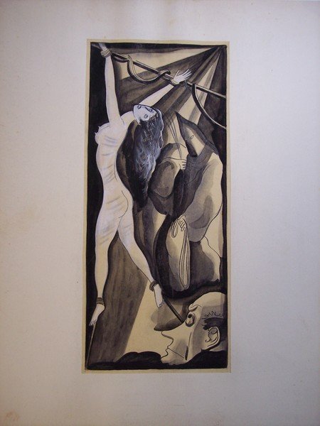 Tavola di cm. 24,5 x 10,5 eseguita a inchiostro, tempera, acquerello con tocchi di biacca.<BR>Il foglio, non firmato, è applicato su un cartoncino.<BR>(vd. Paris-Magazine, aprile 1935)<BR>OTTIME CONDIZIONI.