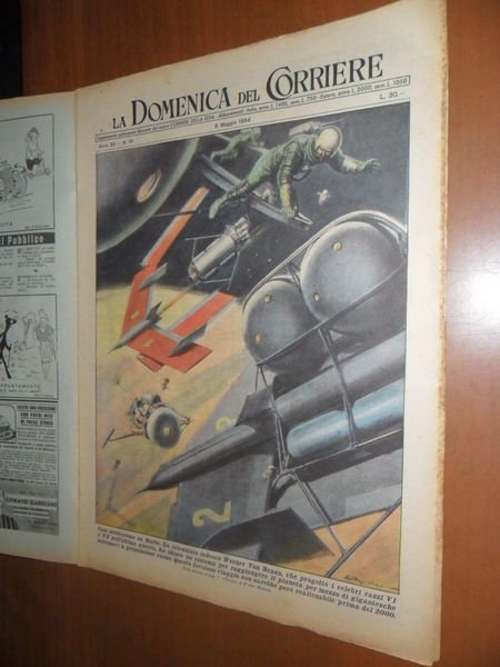 DESCRIZIONE: Domenica del Corriere, Milano, Anno 56 n. 19 (9 Maggio 1954). COPERTINA: "Così arriveremo su Marte. Lo scienziato tedesco Werner Von Braun, che progettò i celebri razzi V1 e V2 nell'ultima guerra, ha ideato un sistema per raggiungere il pianeta per mezzo di gigantesche astronavi a propulsione razzo. Questo favoloso viaggio non sarebbe però realizzabile prima del 2000." (dis. W. Molino) RETRO: "Un fango che uccide. Un calesse che stava passando a guado il torrente Nola in Abruzzo ha cominciato ad un tartto a sprofondare." (dis. W. Molino) CONDIZIONI: Buone. Con spille e sovraccoperta staccata, qualche strappetto e piccole macchie. PESO / WEIGHT: 100 gr. without package