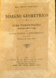 Cesare Torricelli, Disegno geometrico. Guida teorico-pratica per uso degli alunni di 1a classe delle scuole tecniche e complementari approvata d al Ministero della Istruzione Pubblica, Ditta G. B. Paravia e Comp., Torino 1902, interamente ill. con 50 tavv. b.n., cm 18, mezza tela. Firma dell'autore. Tracce d'uso ai piatti, firma d'appartenenza a lapis alla seconda pagina, legatura lievemente allentata, ma interno ben conservato.